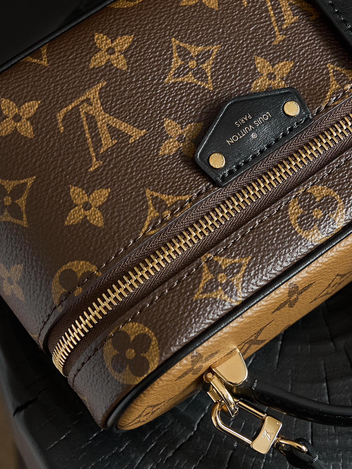 Introducing the Vanity Chain Pouch Handbag, model #M47125 – an exquisite piece crafted in Italy with meticulous attention to detail. This handbag features premium materials, including monogram coated canvas and luxurious cow leather trim. The interior is lined with soft microfiber, ensuring both style and durability.