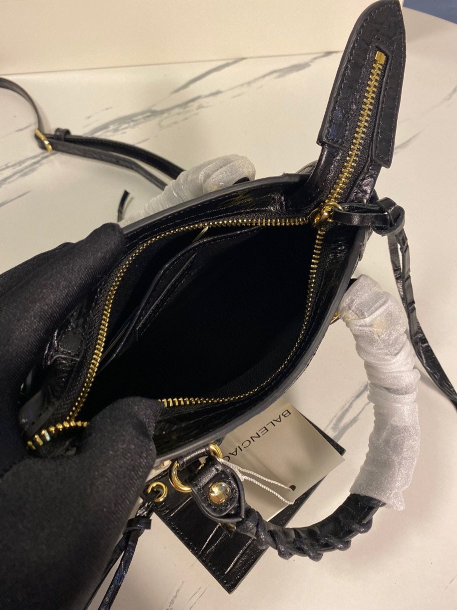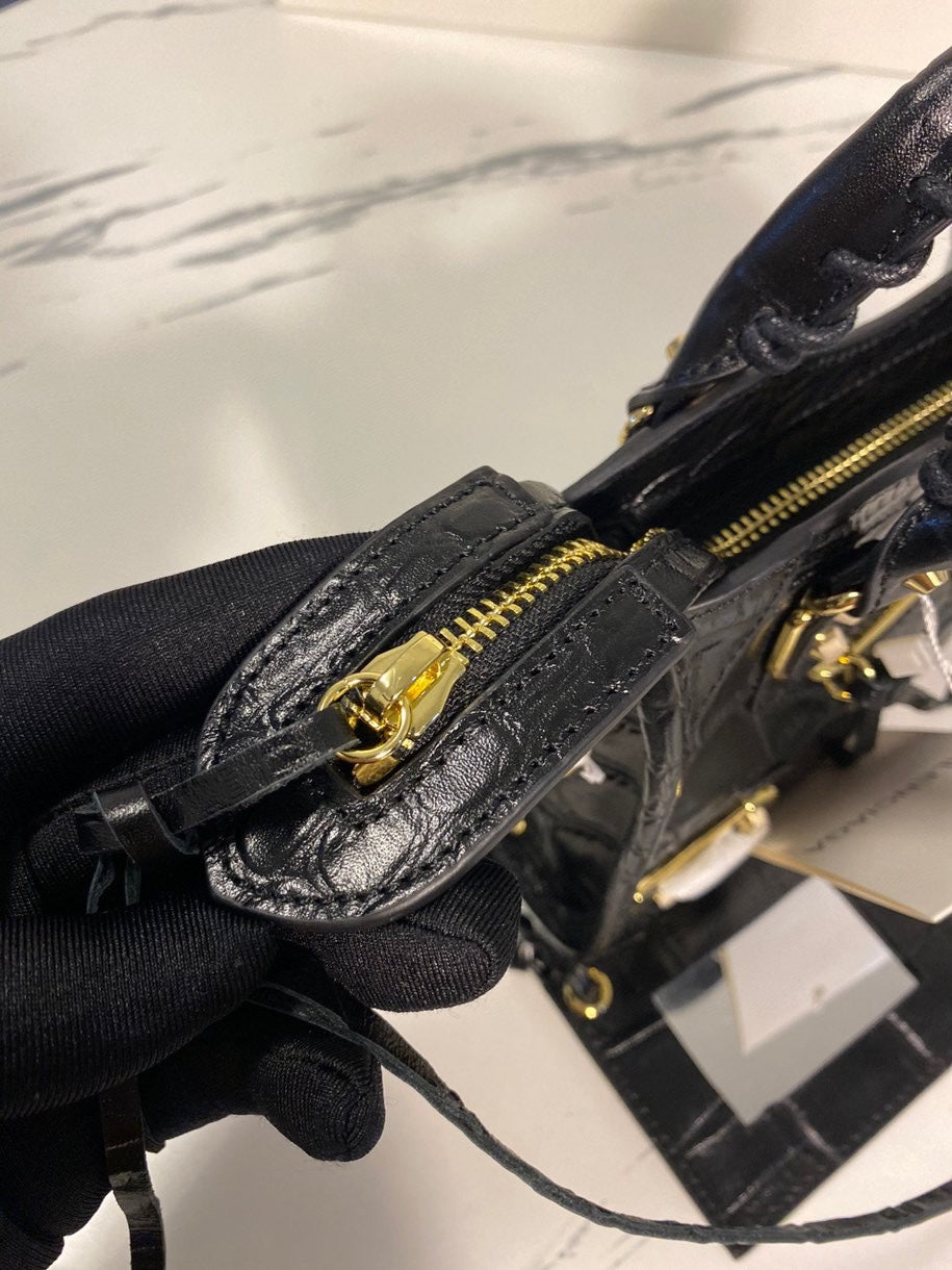 Introducing the Balenciaga Crocodile Pattern Motorcycle Bag, an exquisite blend of functionality and luxury. Crafted from original imported calfskin featuring a stunning crocodile effect, this high-end bag showcases a classic silhouette in an elegant black finish.