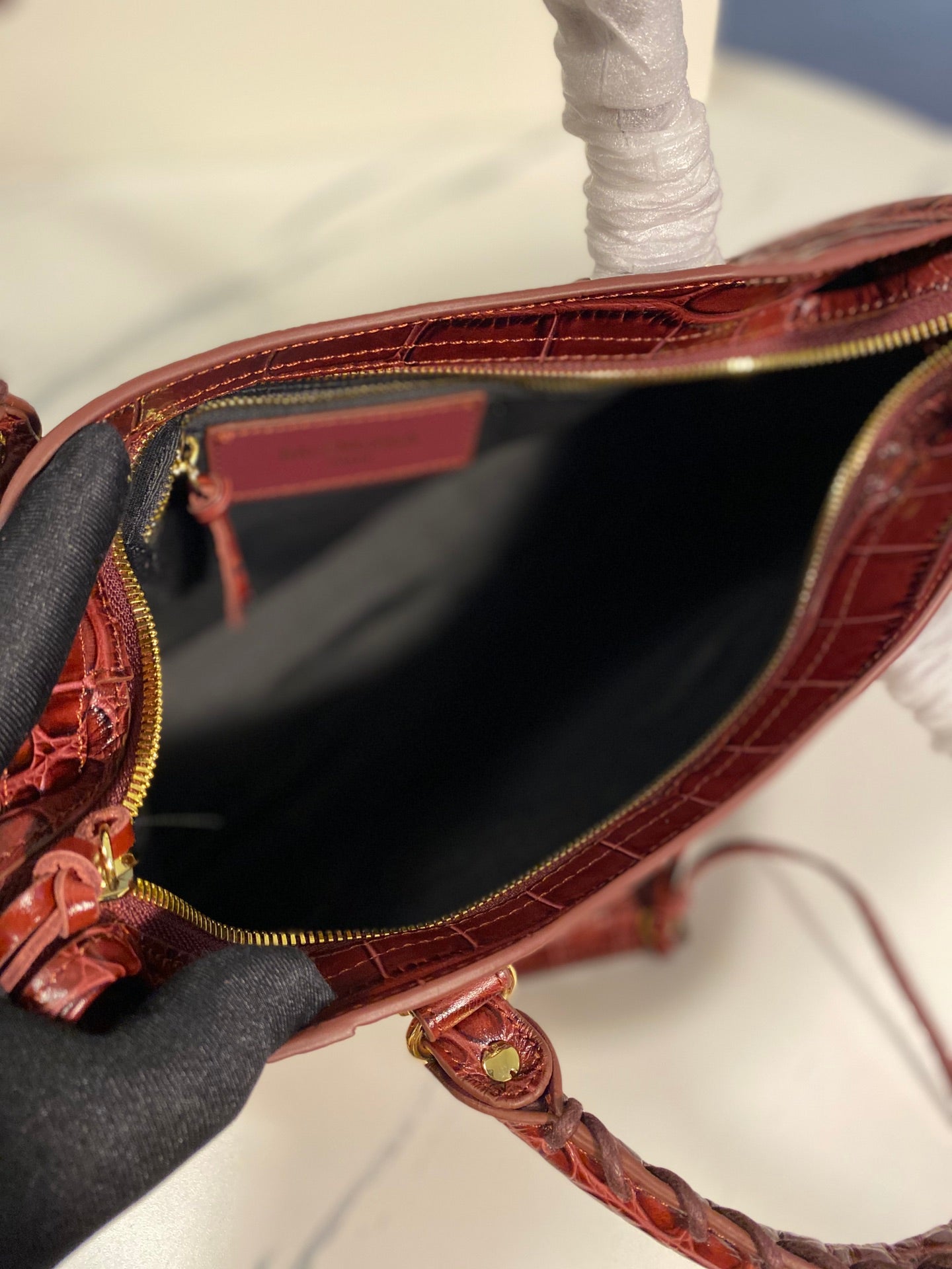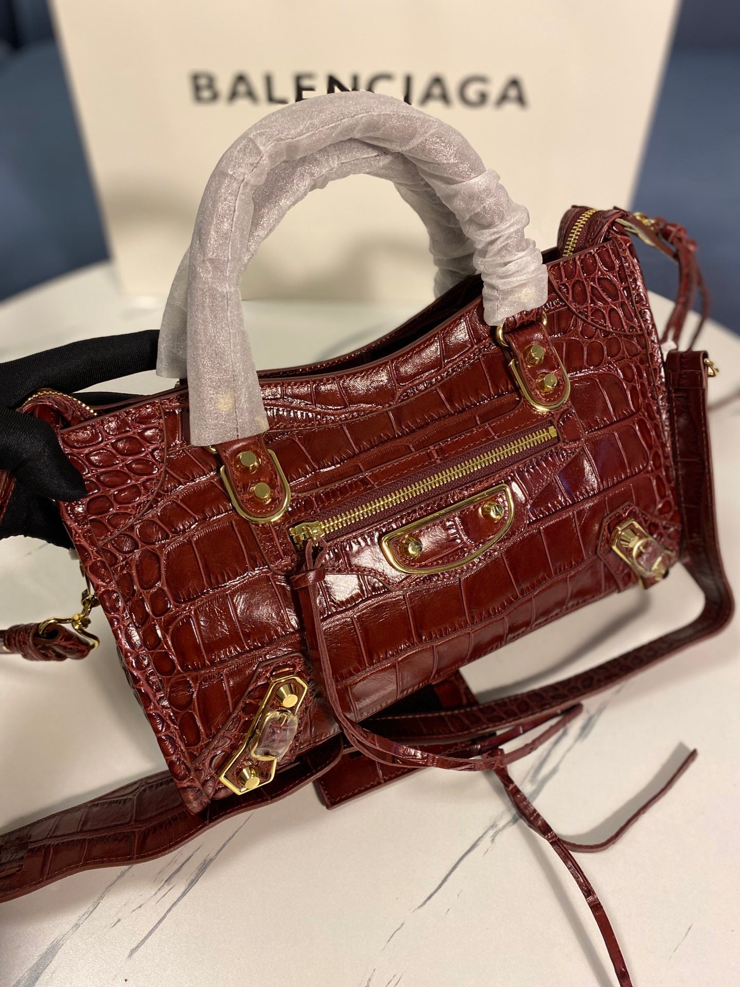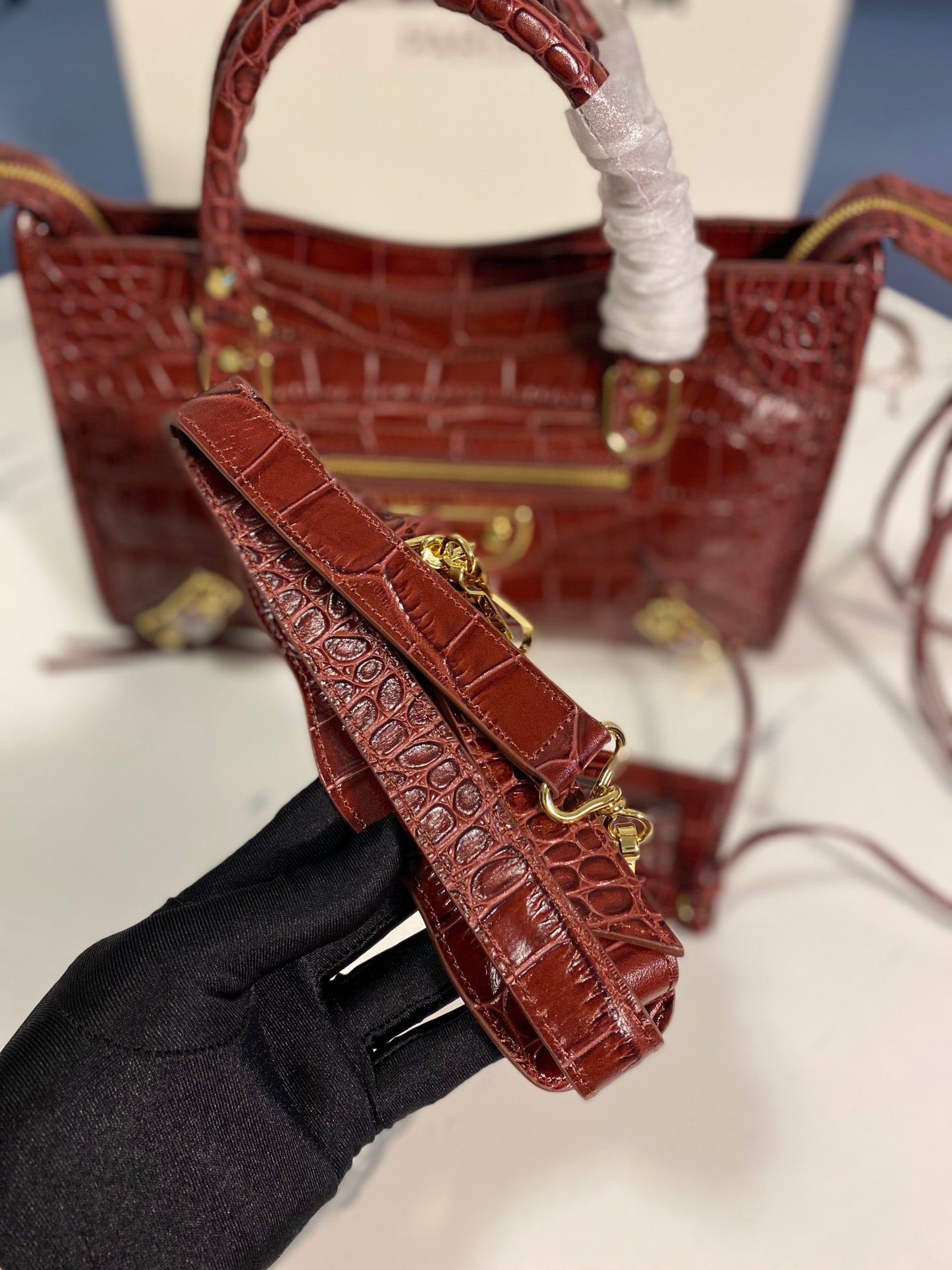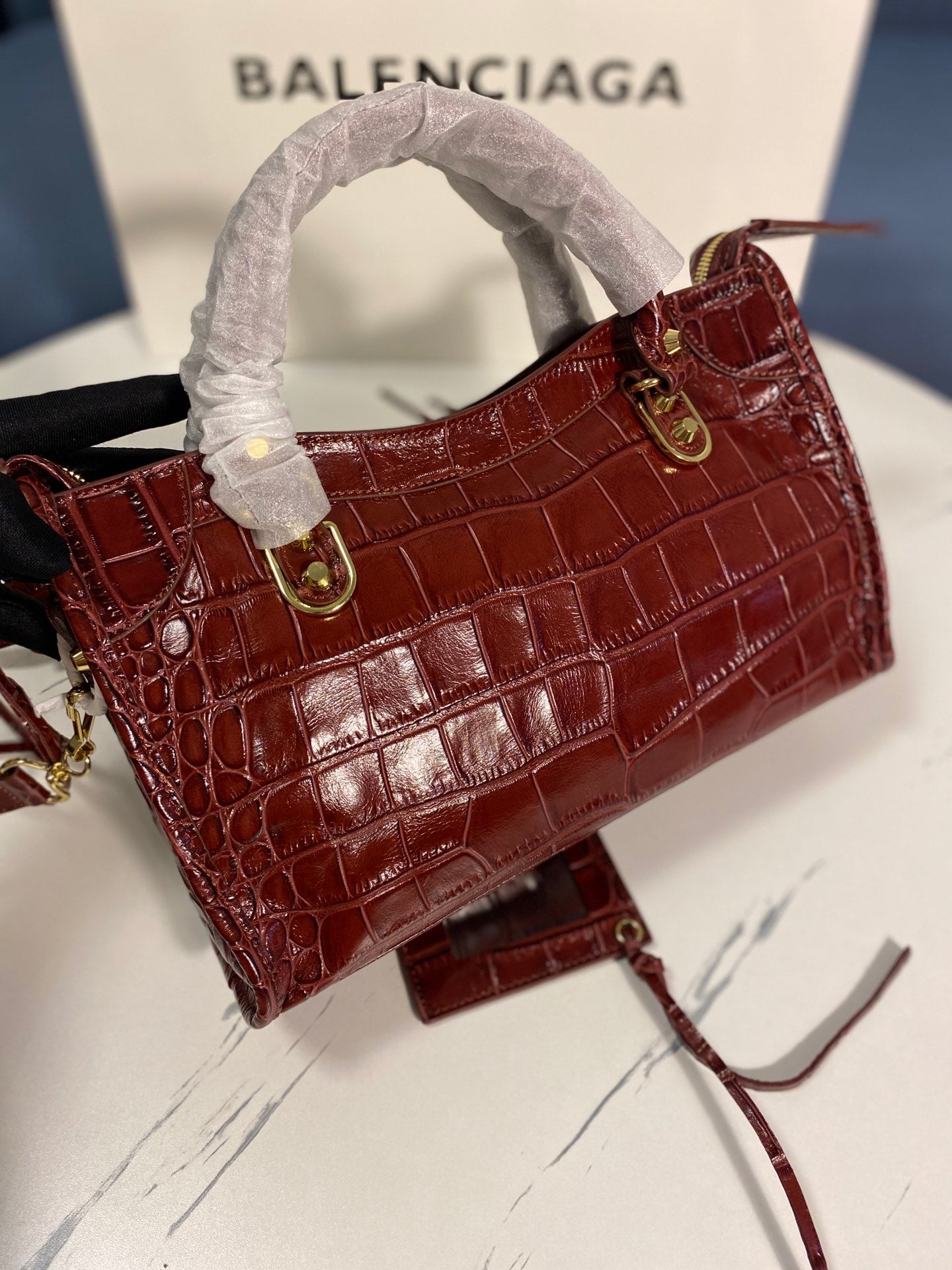 Introducing the Balenciaga Crocodile Pattern Motorcycle Bag, a perfect blend of luxury and functionality. This original order features a stunning crocodile-effect calfskin exterior, exuding elegance and style.