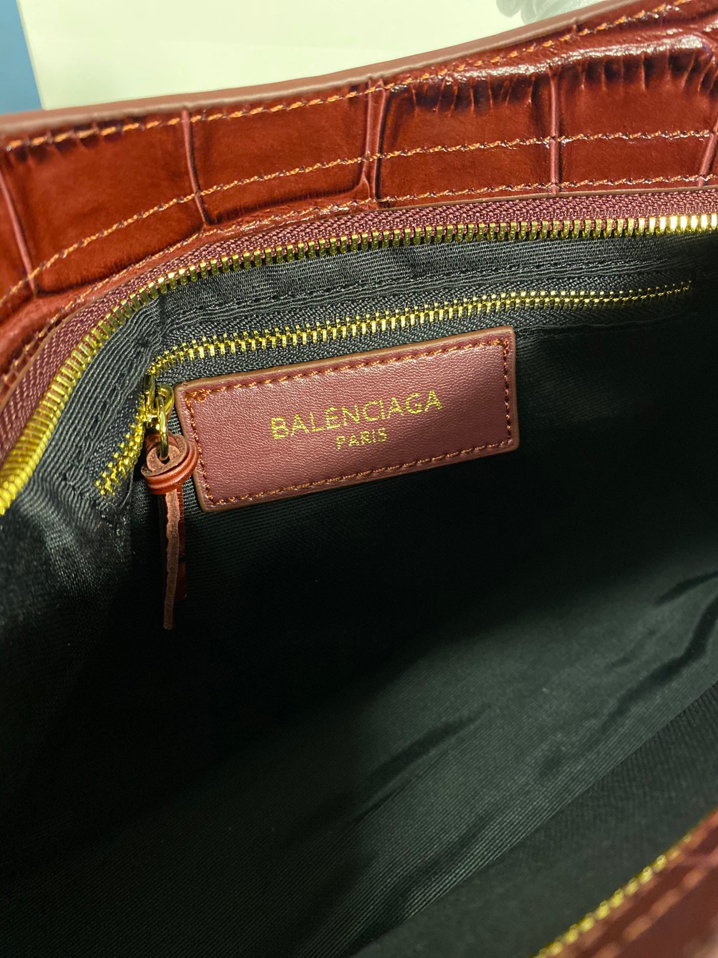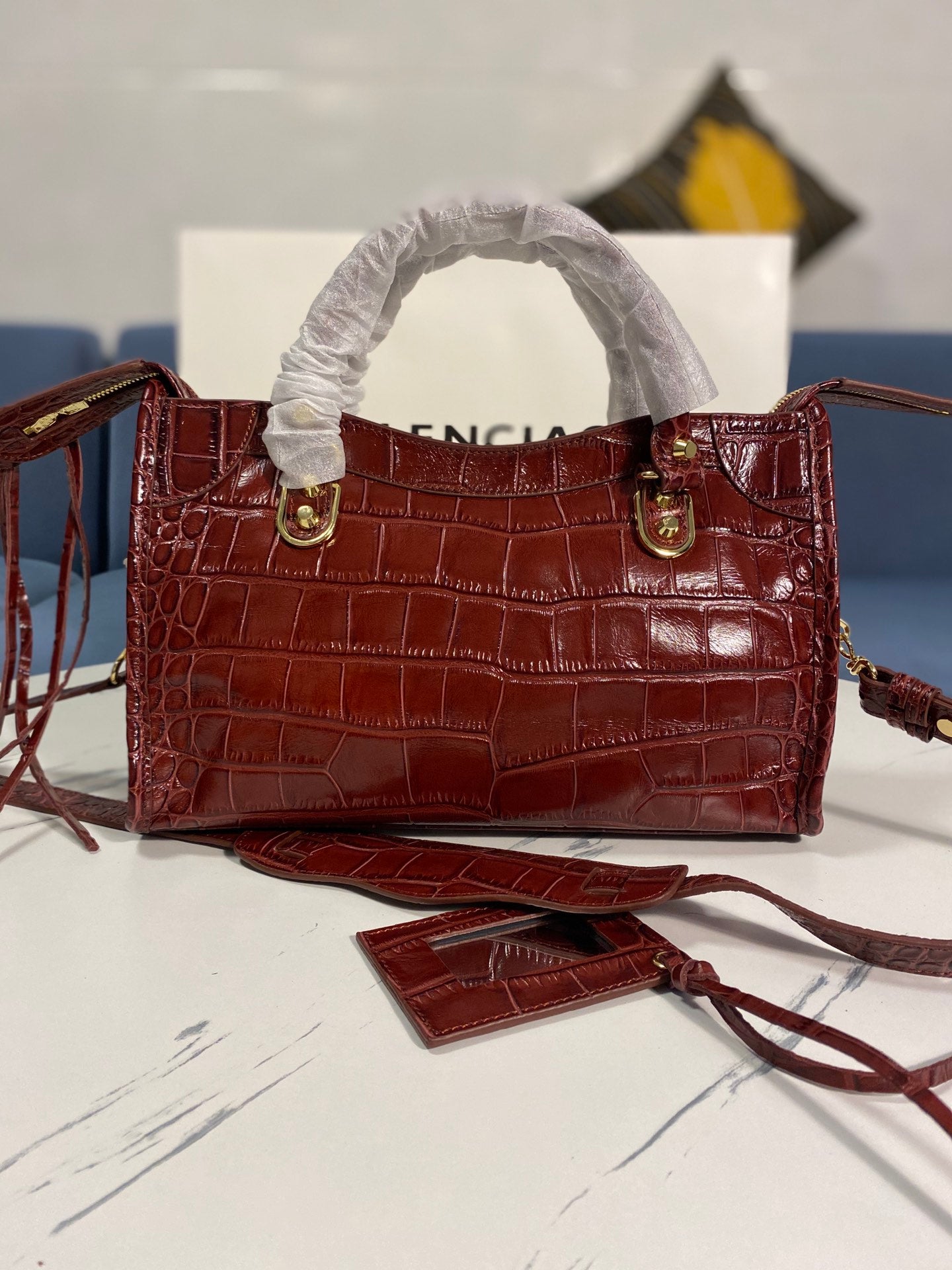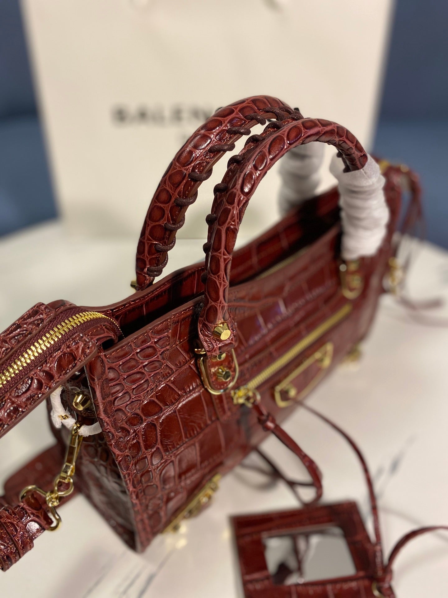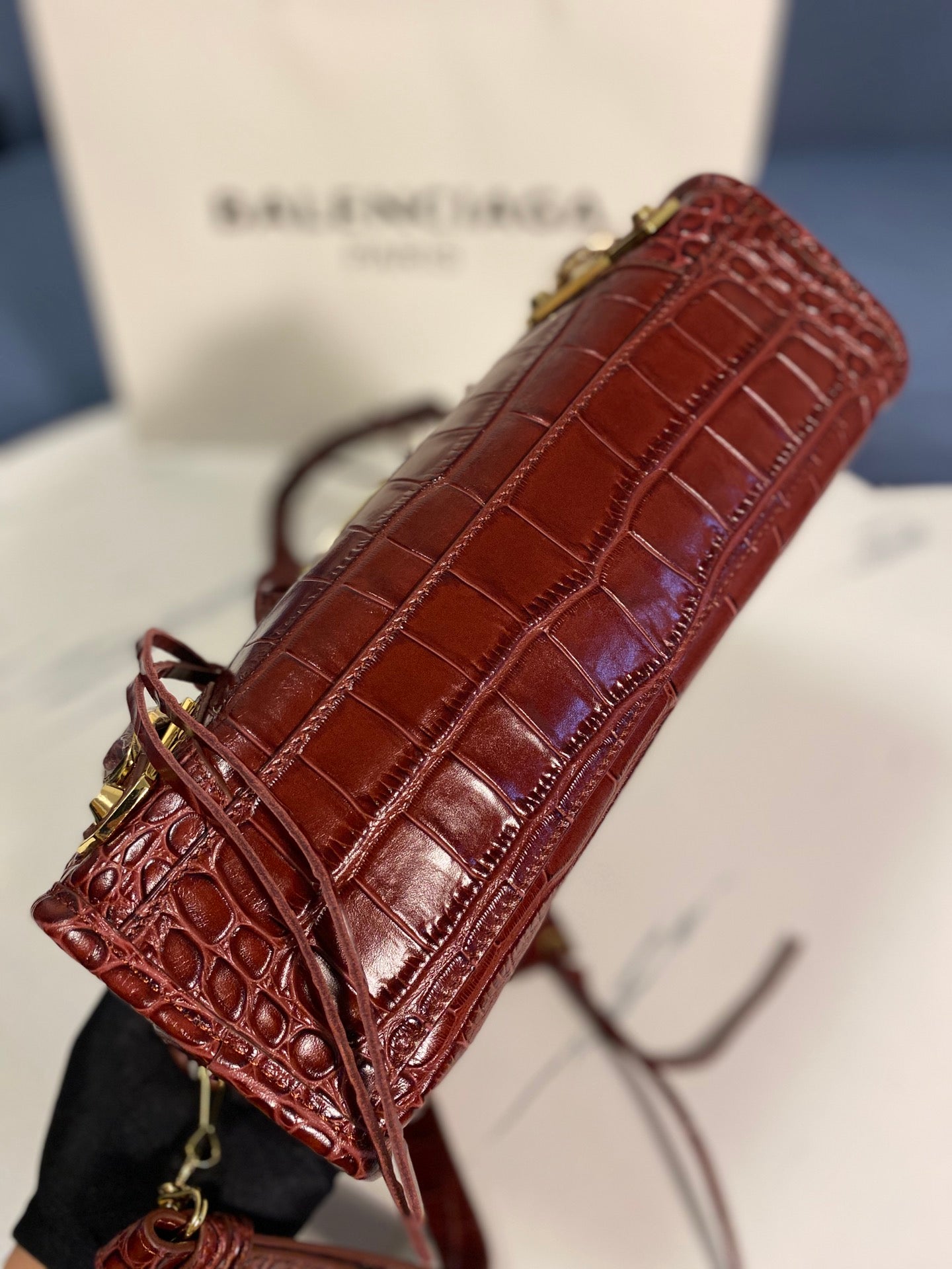 Introducing the Balenciaga Crocodile Pattern Motorcycle Bag, a perfect blend of luxury and functionality. This original order features a stunning crocodile-effect calfskin exterior, exuding elegance and style.