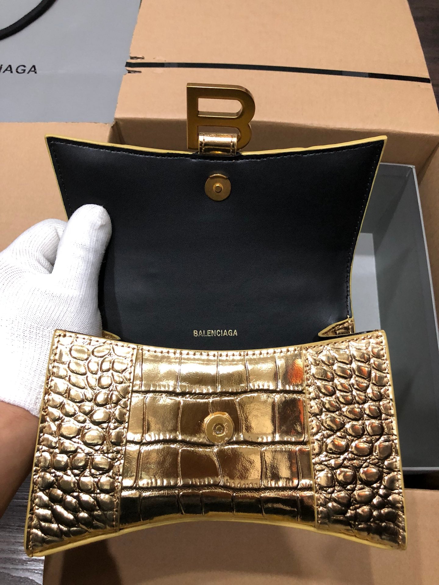 Elevate your accessory game with the Balenciaga Hourglass Handbag, featuring a stunning crocodile-effect finish and a striking golden buckle. This upgraded version comes beautifully packaged, making it the perfect gift or addition to your collection.