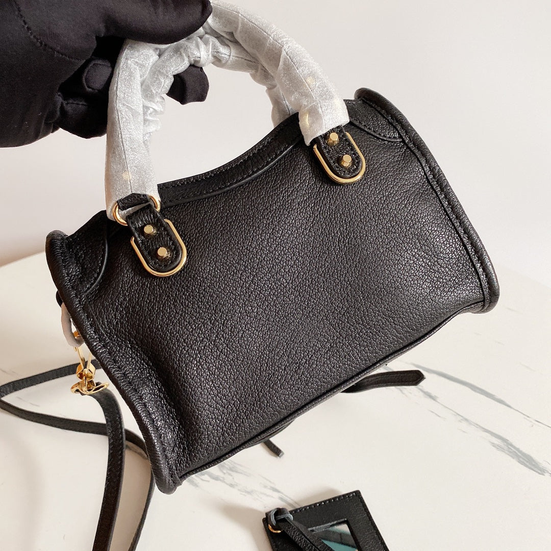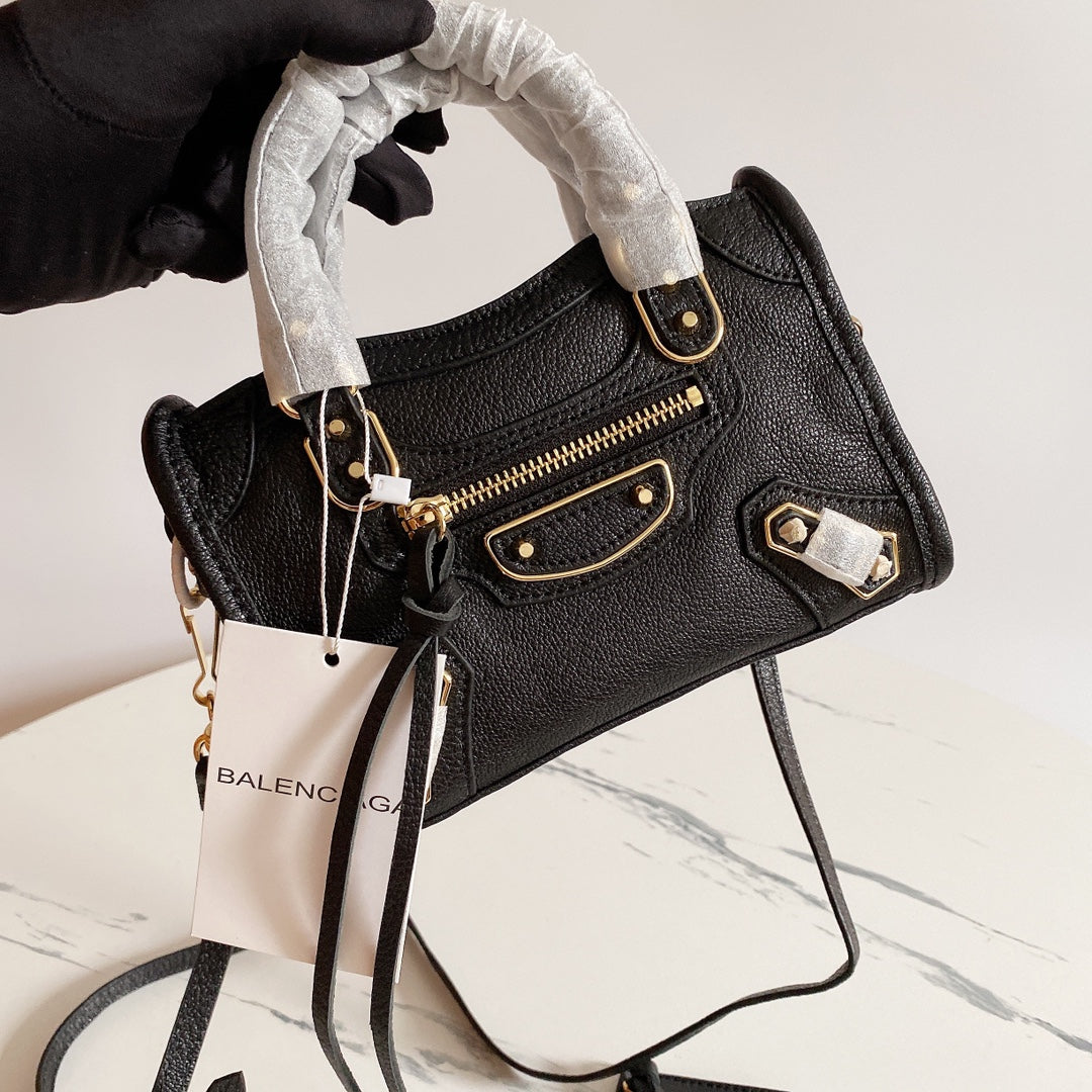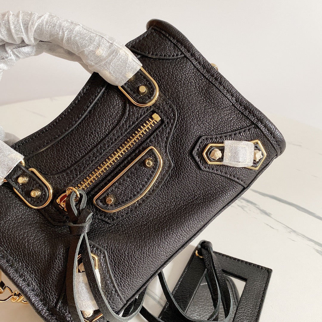 Elevate your style with this exquisite Balenciaga-inspired motorcycle bag, crafted from premium goatskin leather imported from Italy. Featuring a stunning black and gold buckle design, this bag embodies high-end elegance and sophistication.
