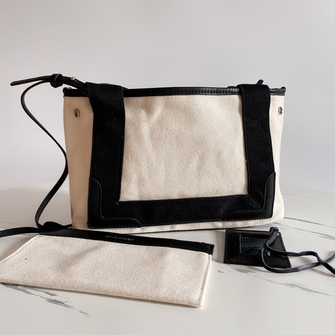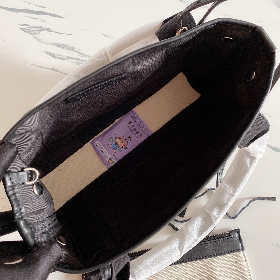 With ample space for organizing your belongings, this bag is perfect for everyday commuting and on-the-go lifestyles. It also includes a cosmetic mirror and a long shoulder strap for added convenience. Dimensions: 25 x 18 x 9 cm. Elevate your fashion game with the Balenciaga Navy Cabas, where practicality meets elegance.