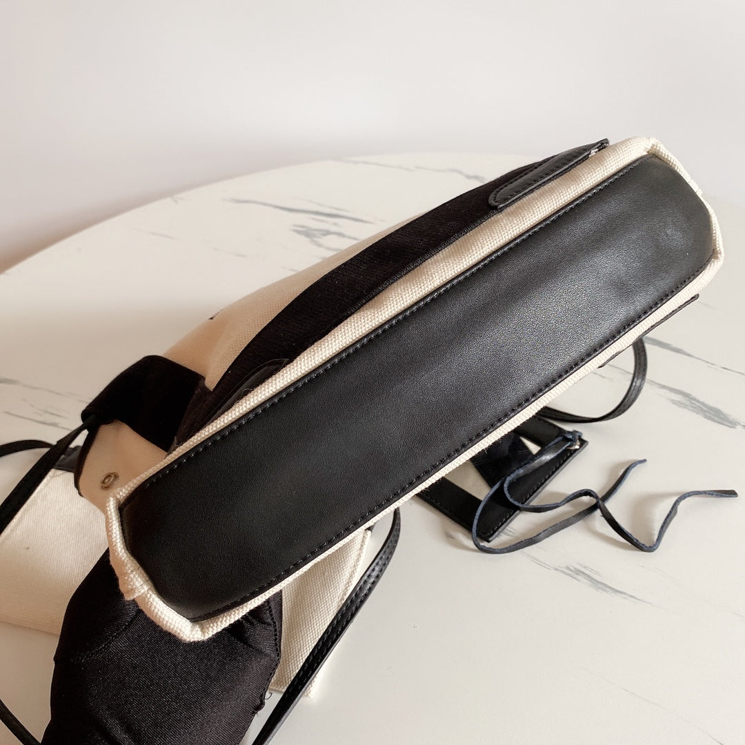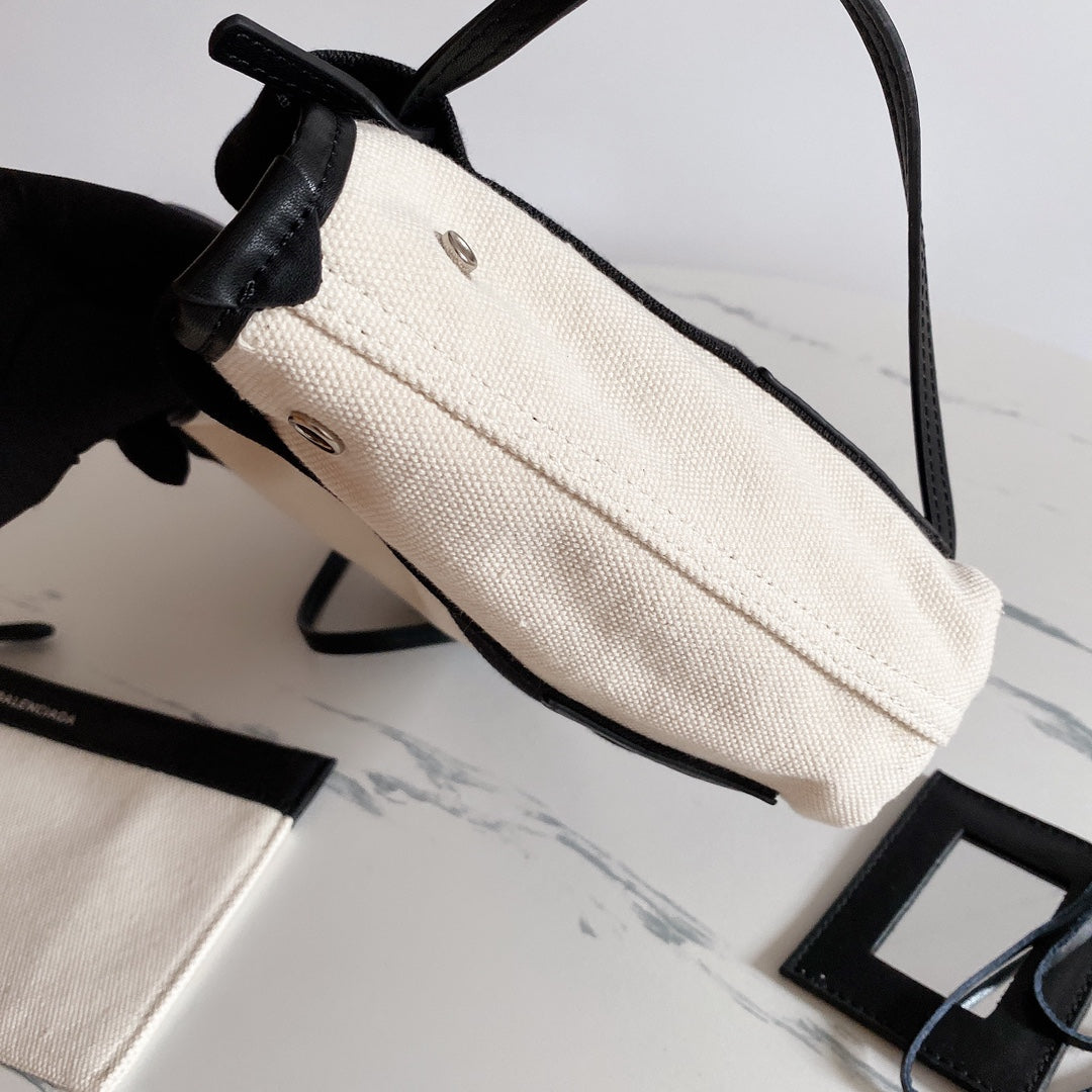 Introducing the Balenciaga Navy Cabas Double Shopping Bag from the Spring/Summer 2017 collection. Crafted from durable, wear-resistant cotton canvas and trimmed with premium cow leather, this bag exemplifies both style and functionality. The innovative snap buttons on either side allow you to customize the bag's shape, making it as versatile as it is chic.