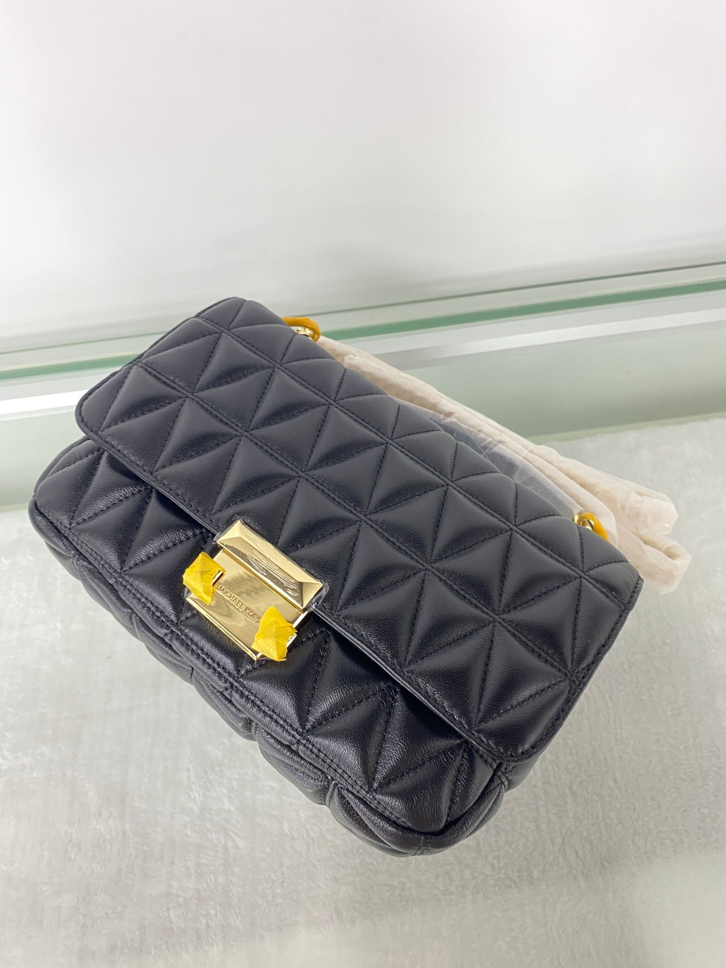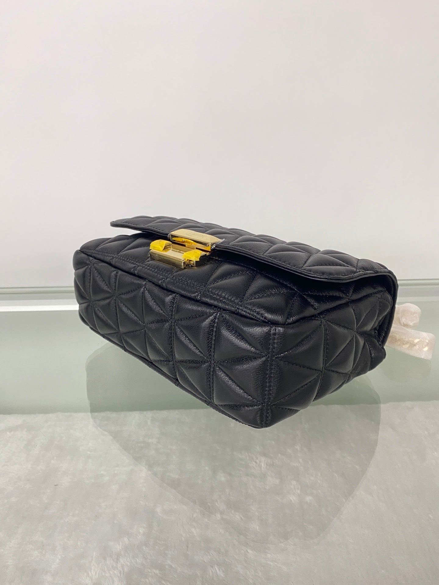 Elevate your style with our Sloan Series Black Diamond Sheepskin Medium Women's Chain Bag. Crafted from soft, delicate sheepskin, this elegant bag features a unique locking mechanism and adjustable shoulder straps for ultimate versatility. Its diamond-embossed design adds a touch of sophistication, making it the perfect accessory to complement any outfit. With compact dimensions of 26cm x 17cm x 8cm, this bag beautifully merges practicality with luxury. Perfect for day or night, the Sloan Series bag is a must-have addition to your wardrobe.