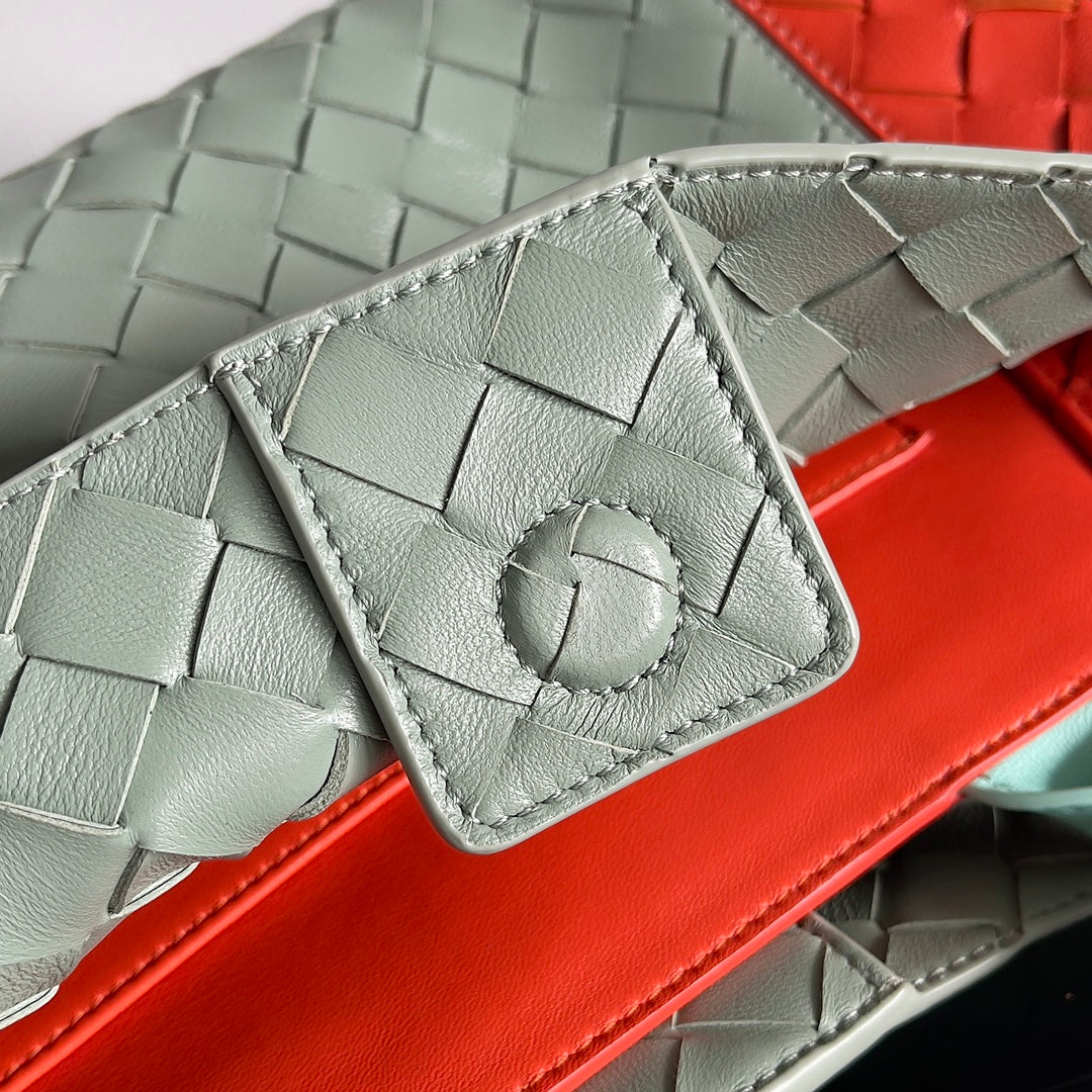 Introducing the Bottega Veneta Andiamo Horizontal Color Block Bag, a vibrant accessory perfect for early autumn. Featuring a striking color scheme complemented by a pop of orange, this bag captures the essence of the season. Crafted from premium lambskin, it seamlessly blends style and functionality. The harmonious integration of the handle and bag design ensures a practical and chic experience. Elevate your wardrobe with this timeless piece.