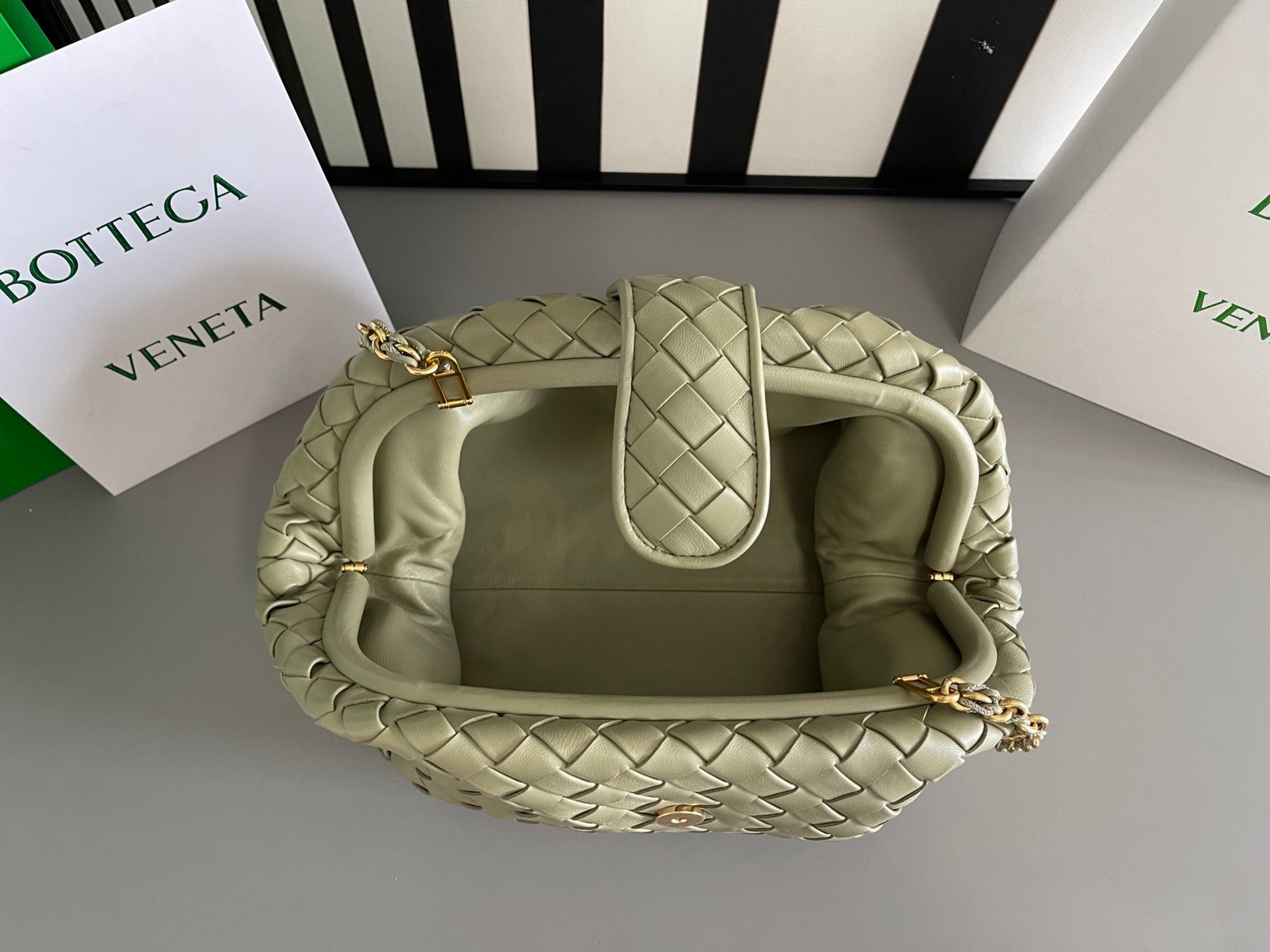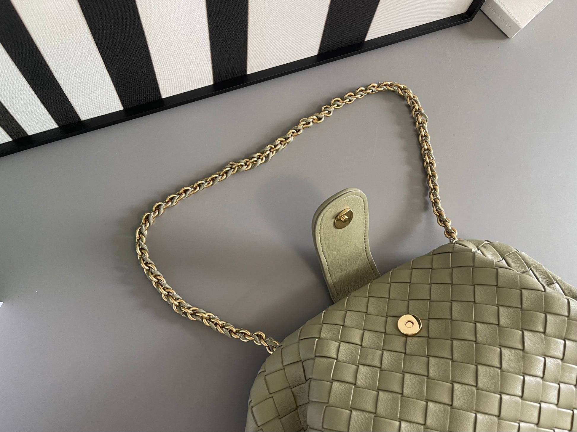 Crafted from exquisite padded intrecciato woven leather, this Teen size clutch is designed for the modern woman who desires style and sophistication. It features a single compartment with a secure magnetic flap closure, and is complemented by a chic leather-woven metal chain shoulder strap for added practicality.