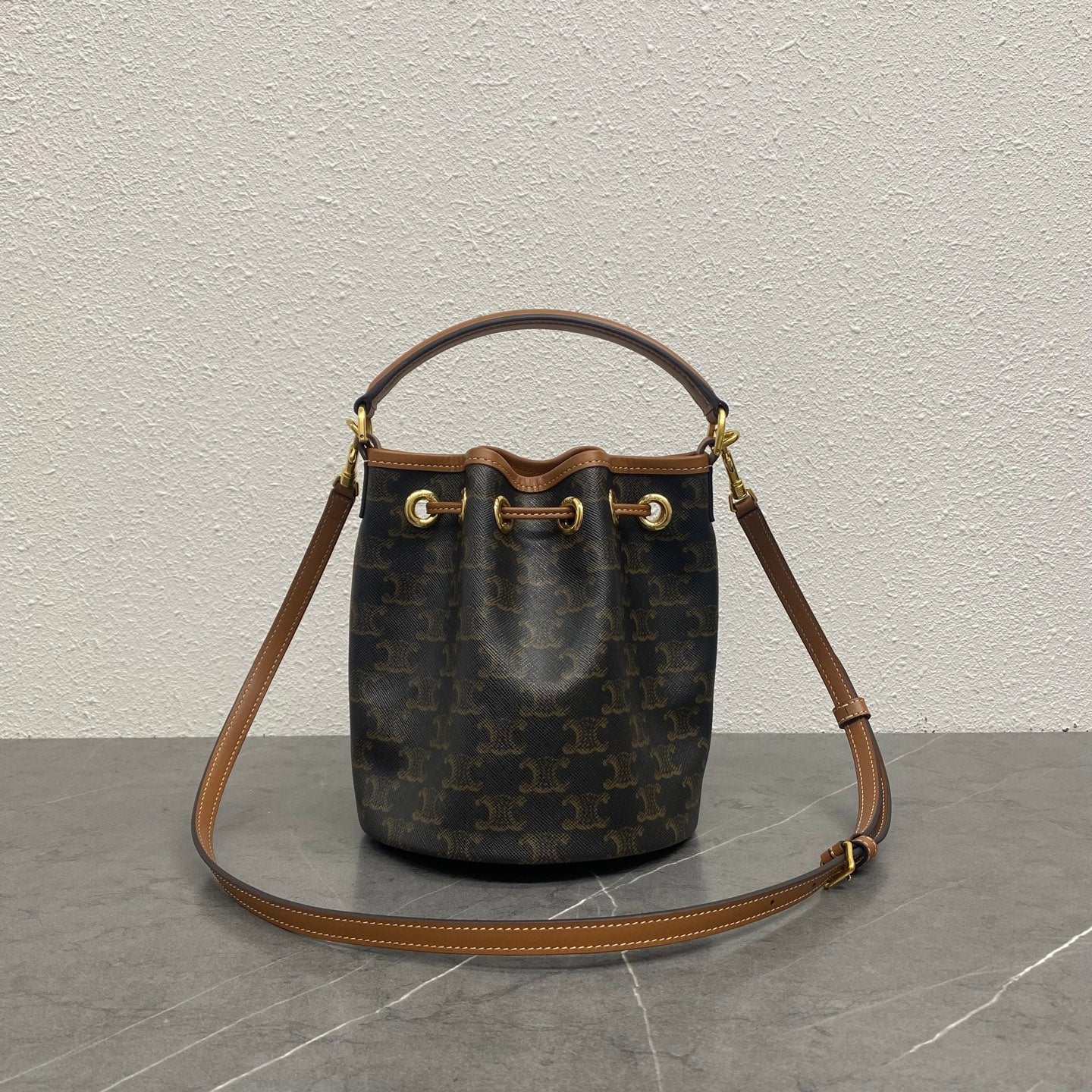 Introducing the Celine Clara Drawstring Bucket Bag, a stylish and practical accessory for the modern commuter. This newly launched bag features a generous capacity with a drawstring closure for easy access. Crafted in a classic ocher brown with the iconic Arc de Triomphe print, it is both wear-resistant and stain-resistant, ensuring durability. The soft fabric lining adds a touch of luxury, while the gold finish accents enhance its elegance.