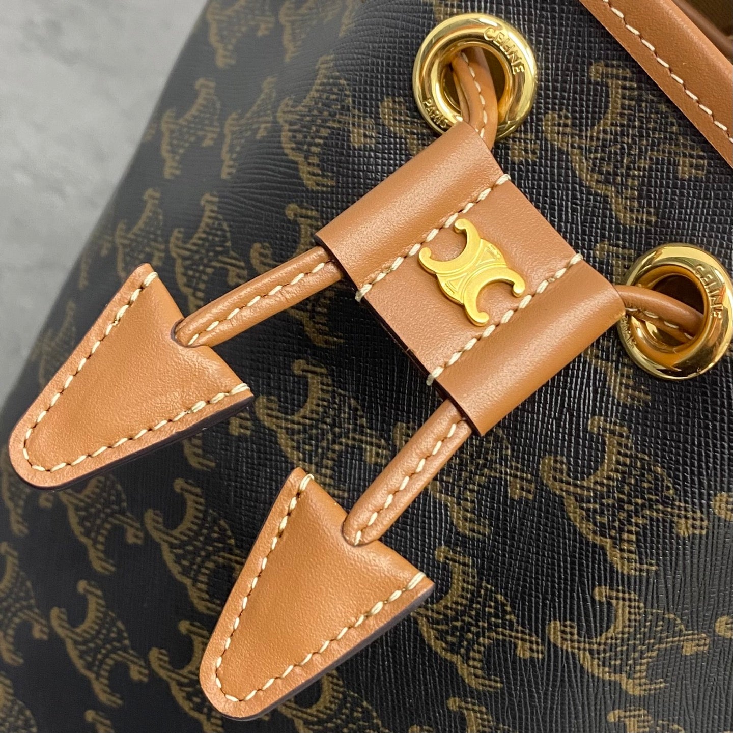 Celine Clara Drawstring Bucket Bag - Ocher Brown Arc de Triomphe Print