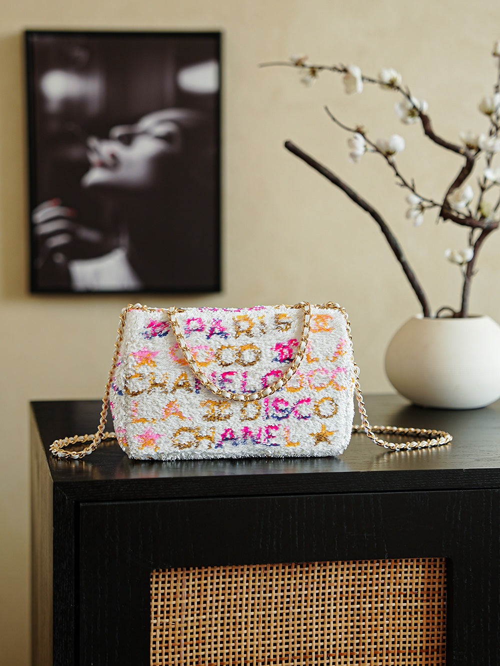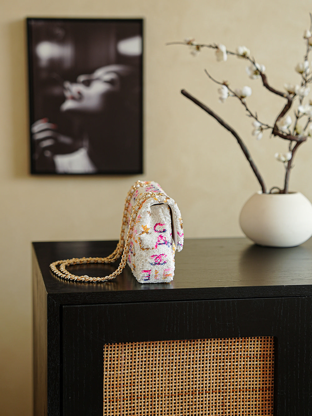Introducing the ChaneL 24C Heavyweight Sequin Crossbody Bag, a dazzling accessory that embodies elegance and style. With dimensions of 14 cm x 21 cm x 8 cm, this bag is perfect for any occasion, whether you’re dressing up for a night out or looking for a chic everyday carry.