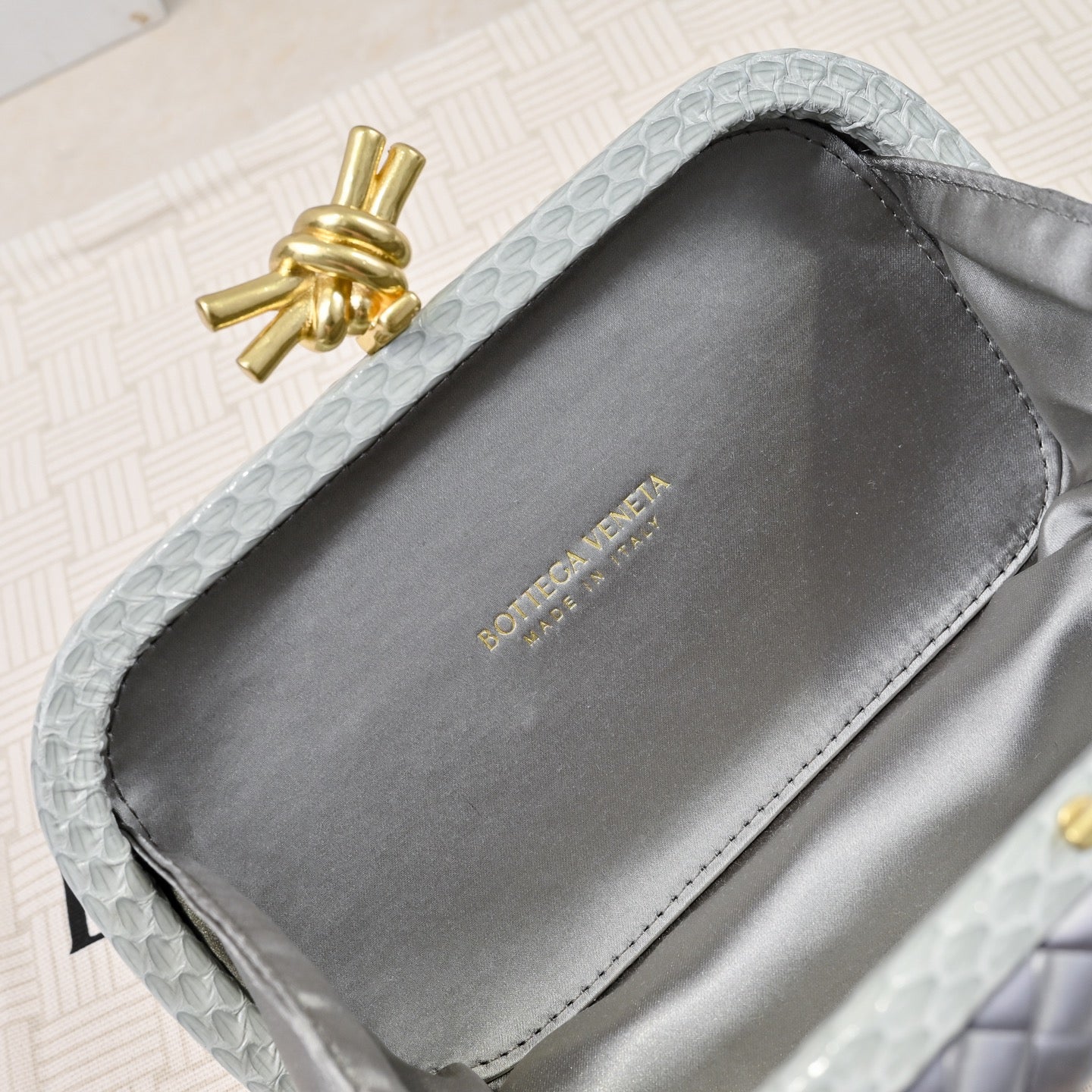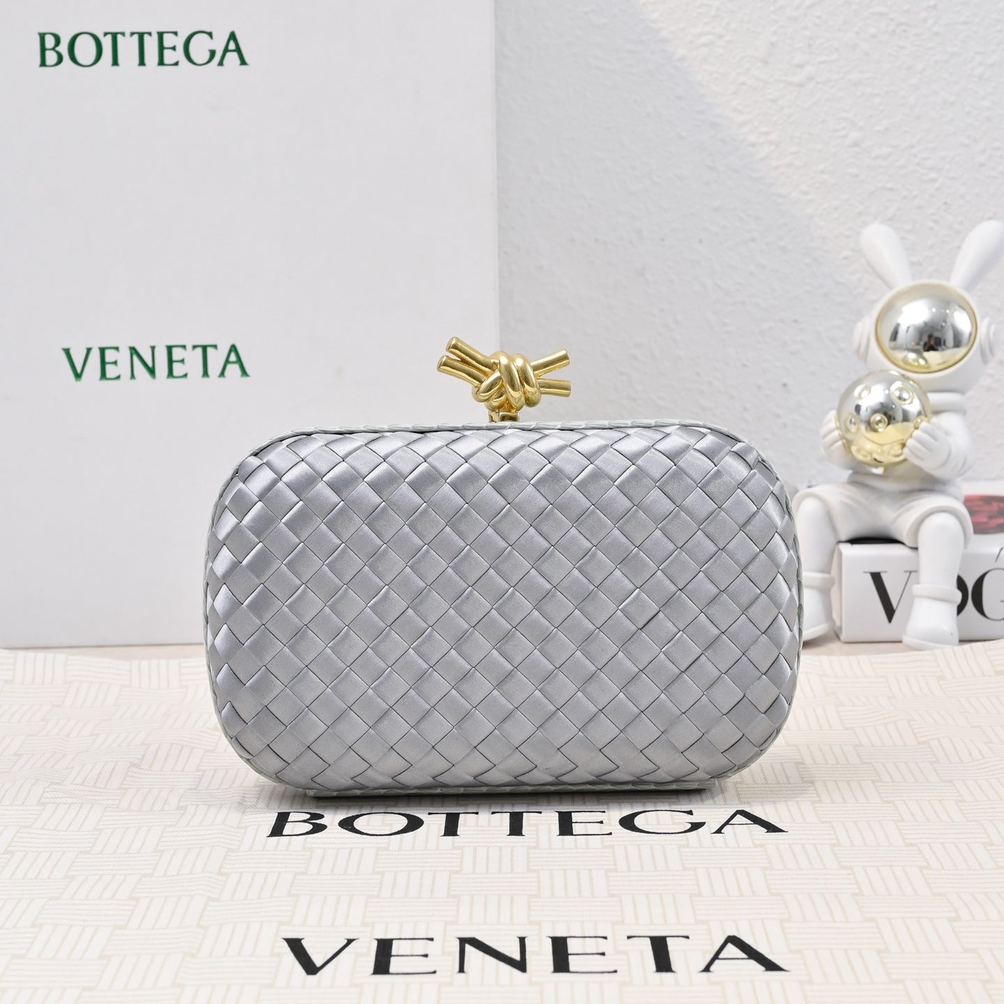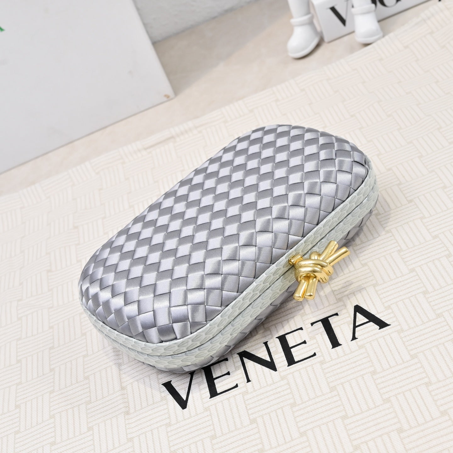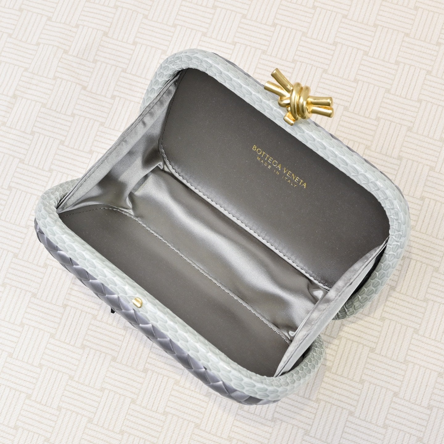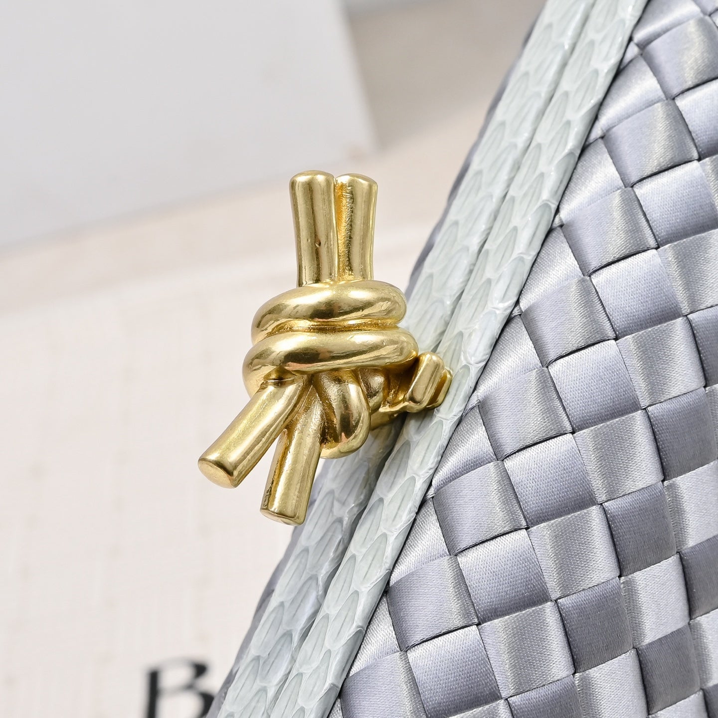 Discover timeless elegance with the BV Knot Woven Evening Bag, a sophisticated accessory that complements any formal attire. Crafted with intricate silk weaving and adorned with a stylish snake skin trim, this handbag features a unique knot buckle that adds a touch of charm.