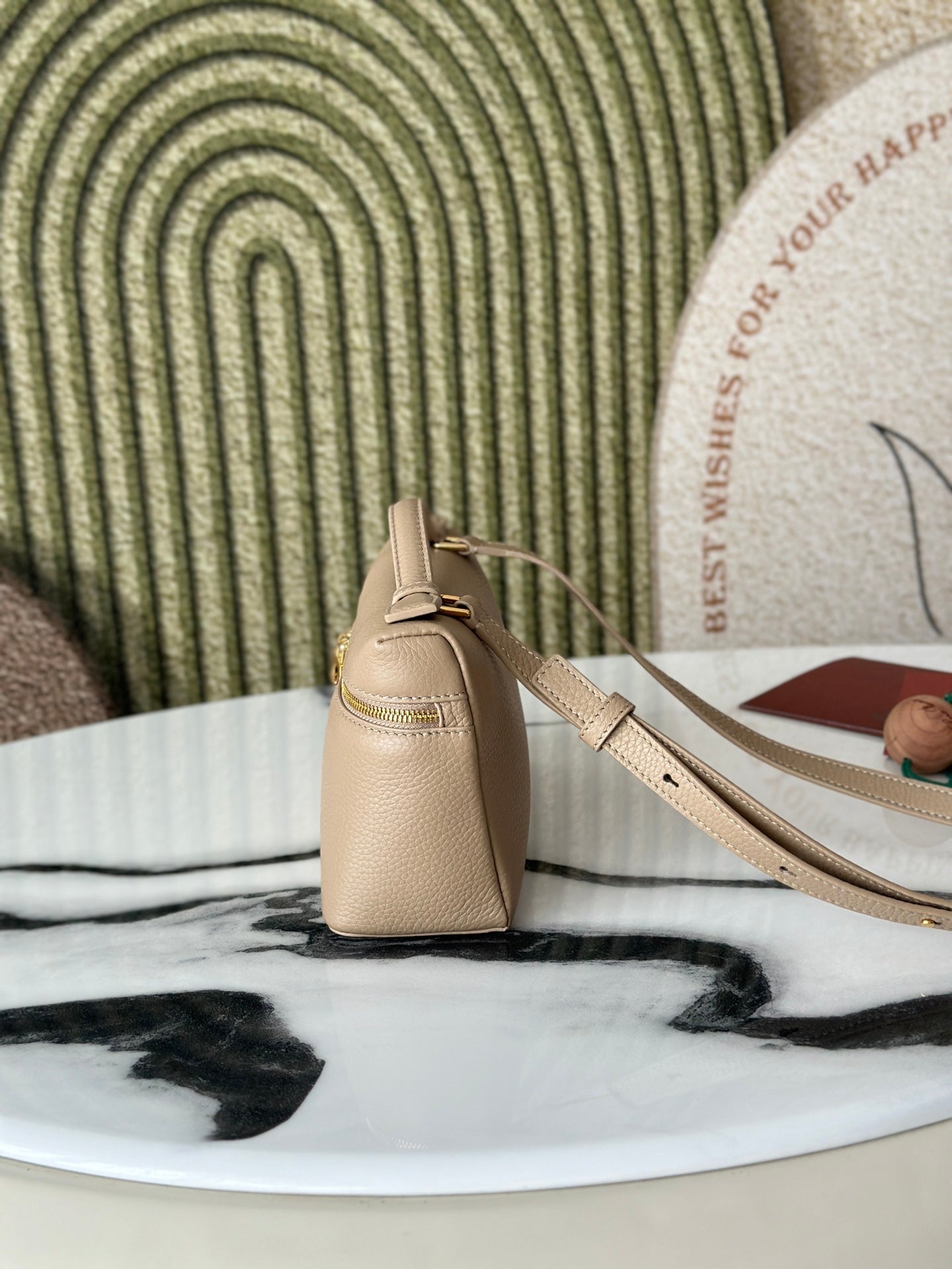 Introducing the L19 Handbag in a sophisticated milk tea color, enhanced with a sleek gold buckle for an elevated aesthetic. This versatile handbag can be worn as a crossbody or shoulder bag and features a unique design with an extra pocket from Loro Piana, adding practicality to its elegance.
