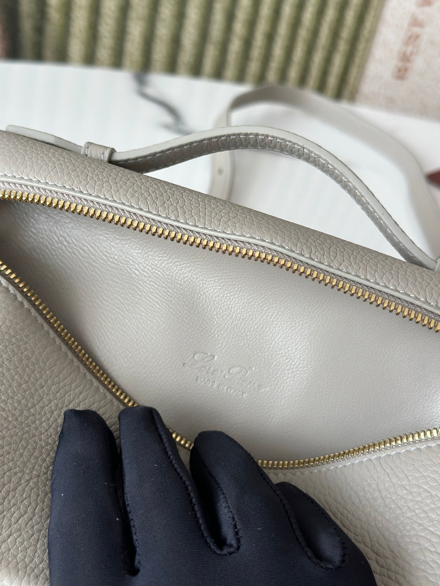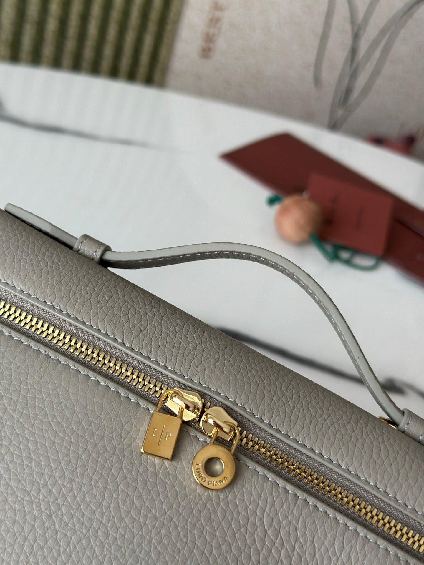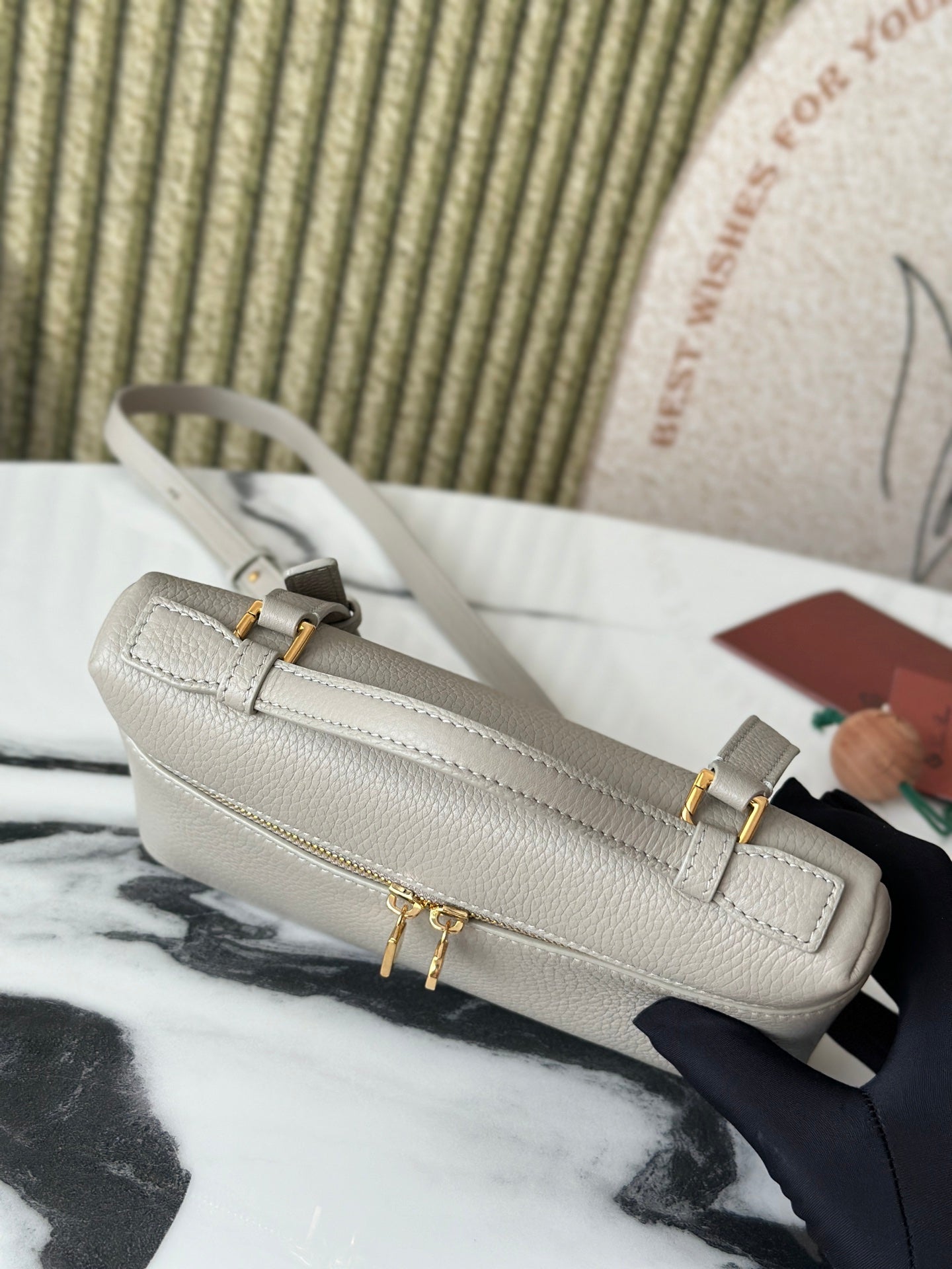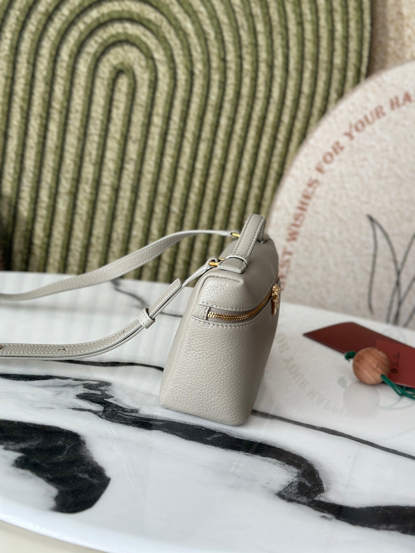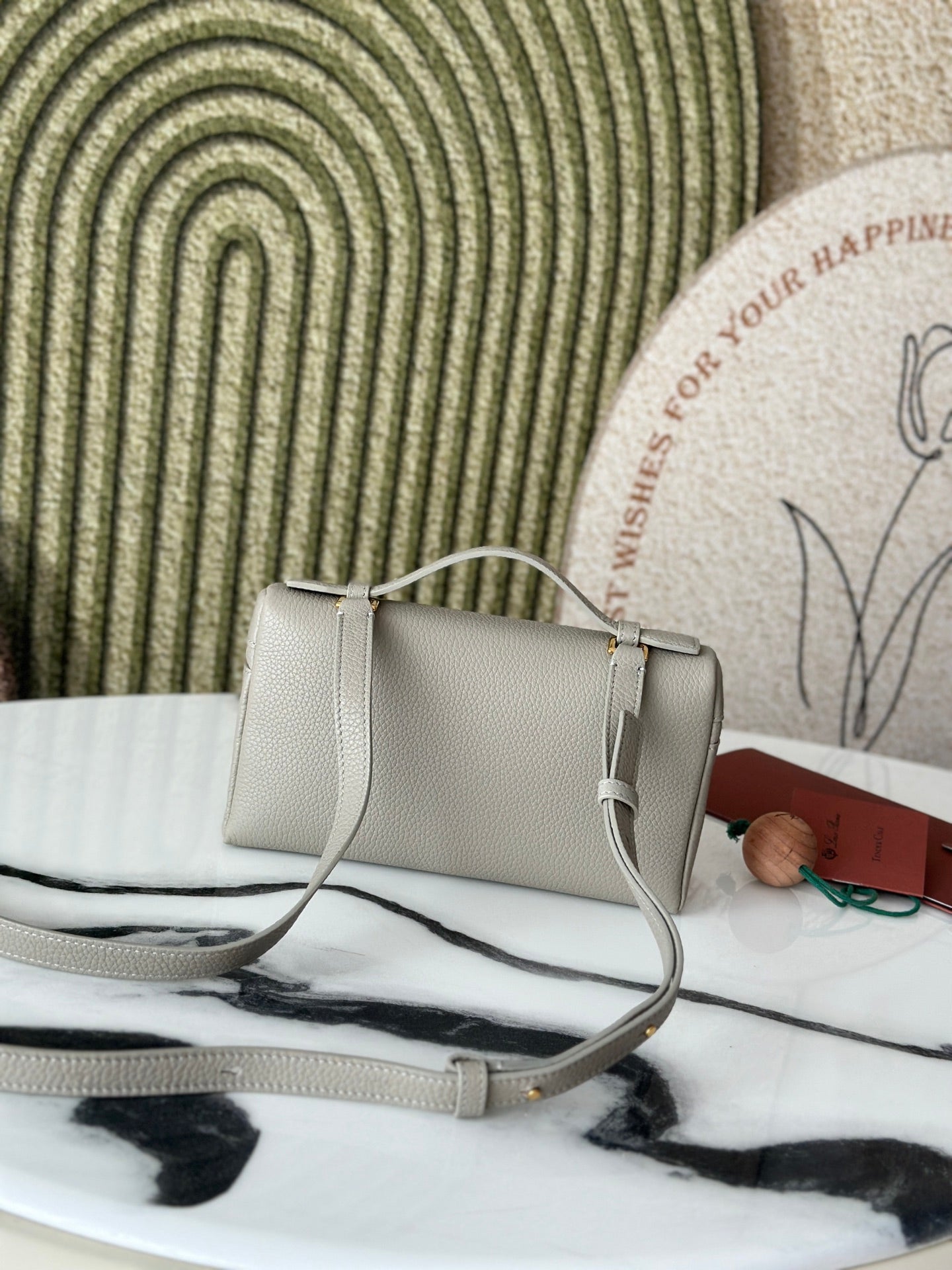 Introducing the L19 Stone Gray Handbag, featuring a sophisticated gold buckle and a new shoulder strap design. This stylish handbag doubles as a crossbody bag, offering versatility for any occasion. Crafted from premium Loro Piana materials, it includes an extra pocket for convenient storage.