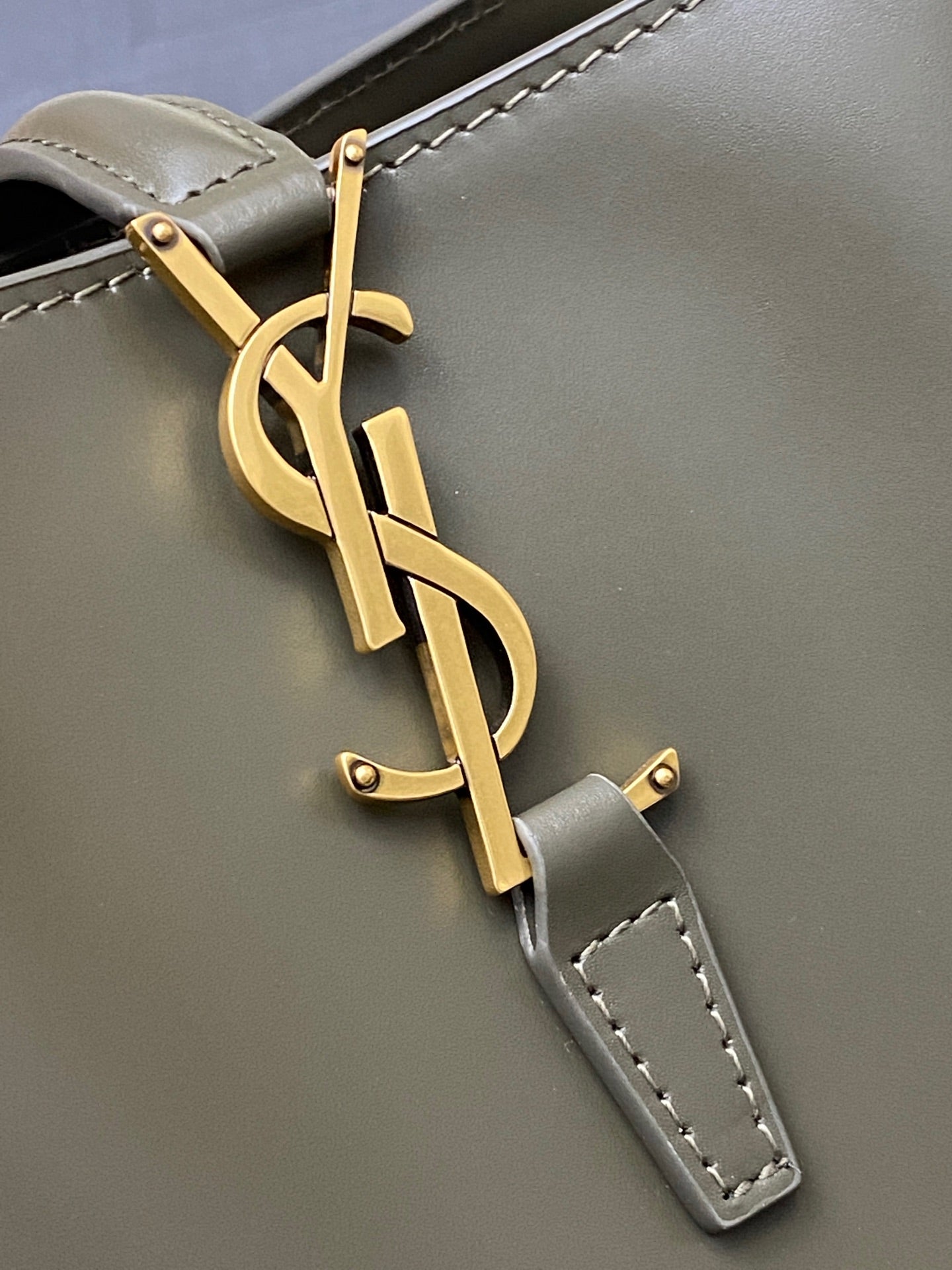 Introducing the LE 5À7 Small Bucket Bag, crafted from luxurious Italian calfskin in a stunning musk green with antique gold accents. This stylish accessory features a sleek, three-dimensional silhouette that balances formality with modern elegance. Designed with practicality in mind, it boasts four sturdy metal feet for stability and a secure plug-in bag buckle adorned with a classic metal logo. Measuring 20x17x13 cm, this bag effortlessly combines timeless sophistication with contemporary flair, making it the perfect addition to any wardrobe. Elevate your style with the LE 5À7 Bucket Bag.