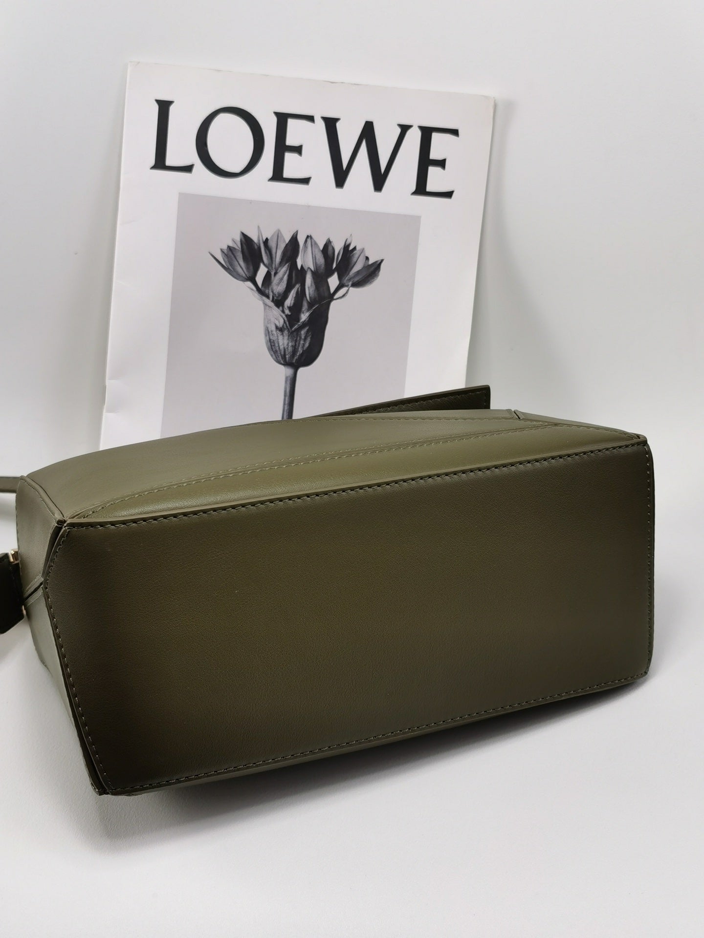 Introducing the LOEWE Small Puzzle Handbag, expertly crafted from genuine imported calf leather. This elegantly designed bag features the iconic cuboid shape and distinctive geometric lines, showcasing precise cutting technology and a striking embossed logo.