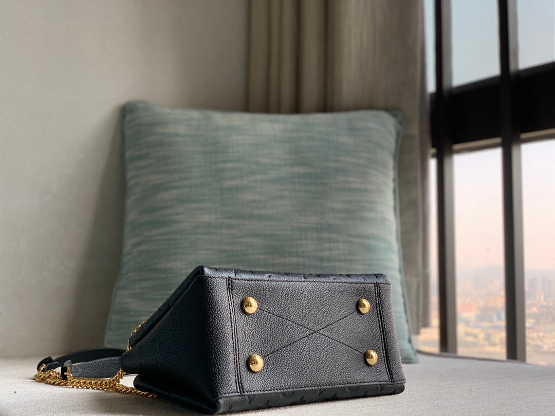 Elevate your style with the Louis Vuitton Surene BB handbag, crafted from luxurious soft Monogram Empreinte leather in a sophisticated black hue. This chic mini tote bag showcases refined monogram prints that blend seamlessly with its exterior. The elegant gold chain handle, complemented by calfskin shoulder pads, adds a touch of color and sophistication to this versatile accessory. A removable leather name tag highlights the brand's iconic features, making it the perfect finishing touch. Dimensions: 24.0 x 17.0 x 11.0 cm. Experience luxury and functionality in one exquisite handbag.
