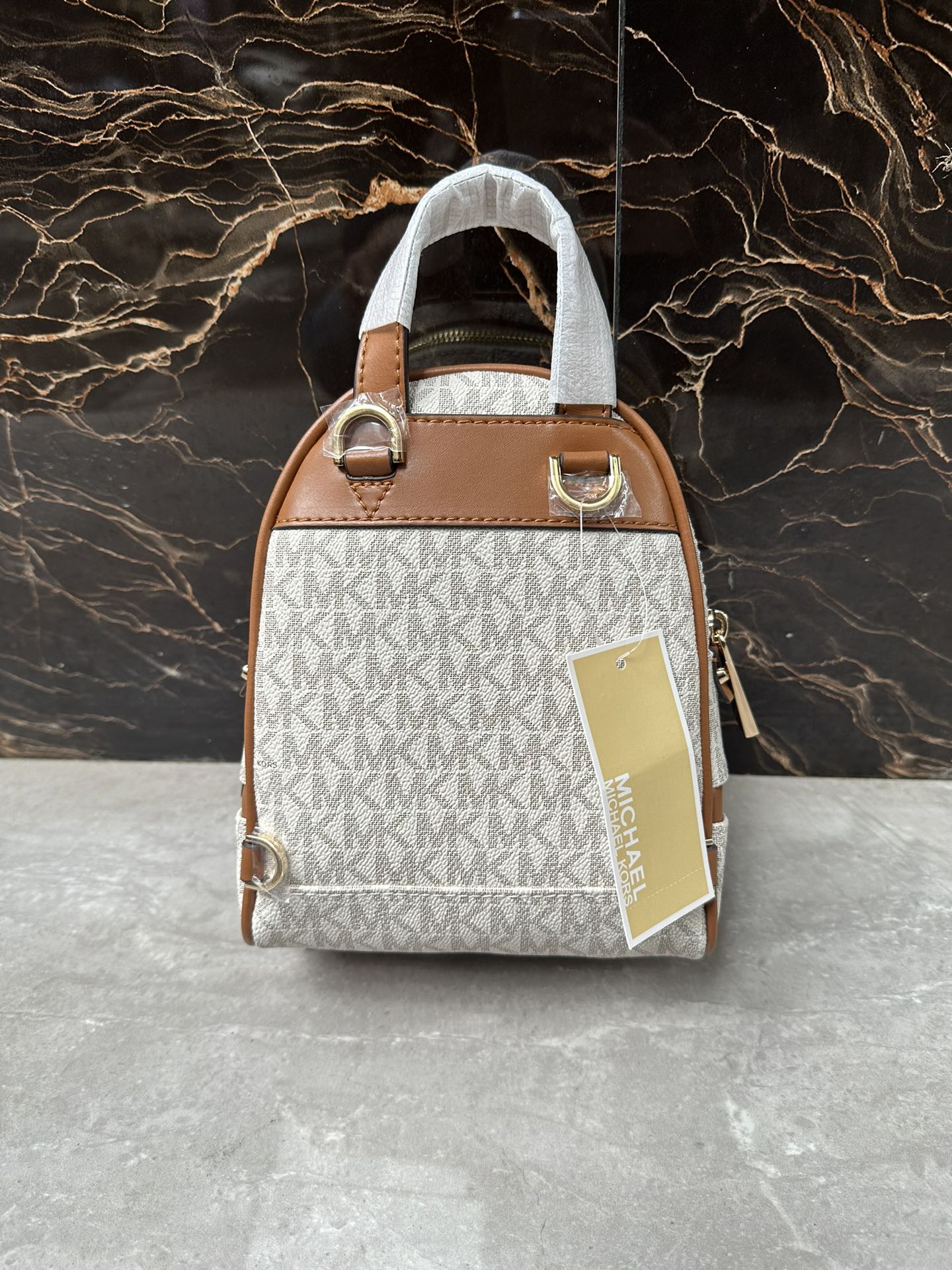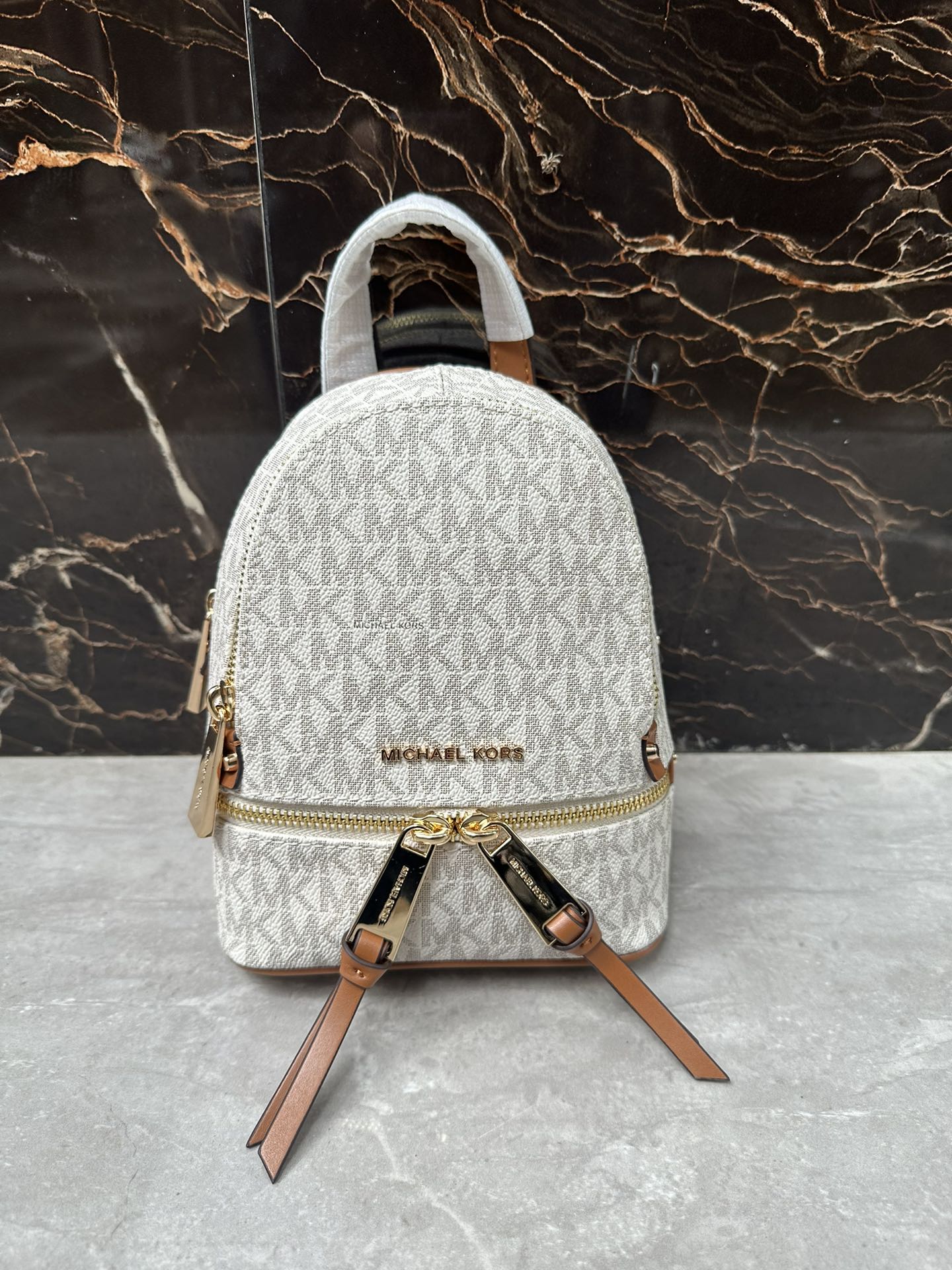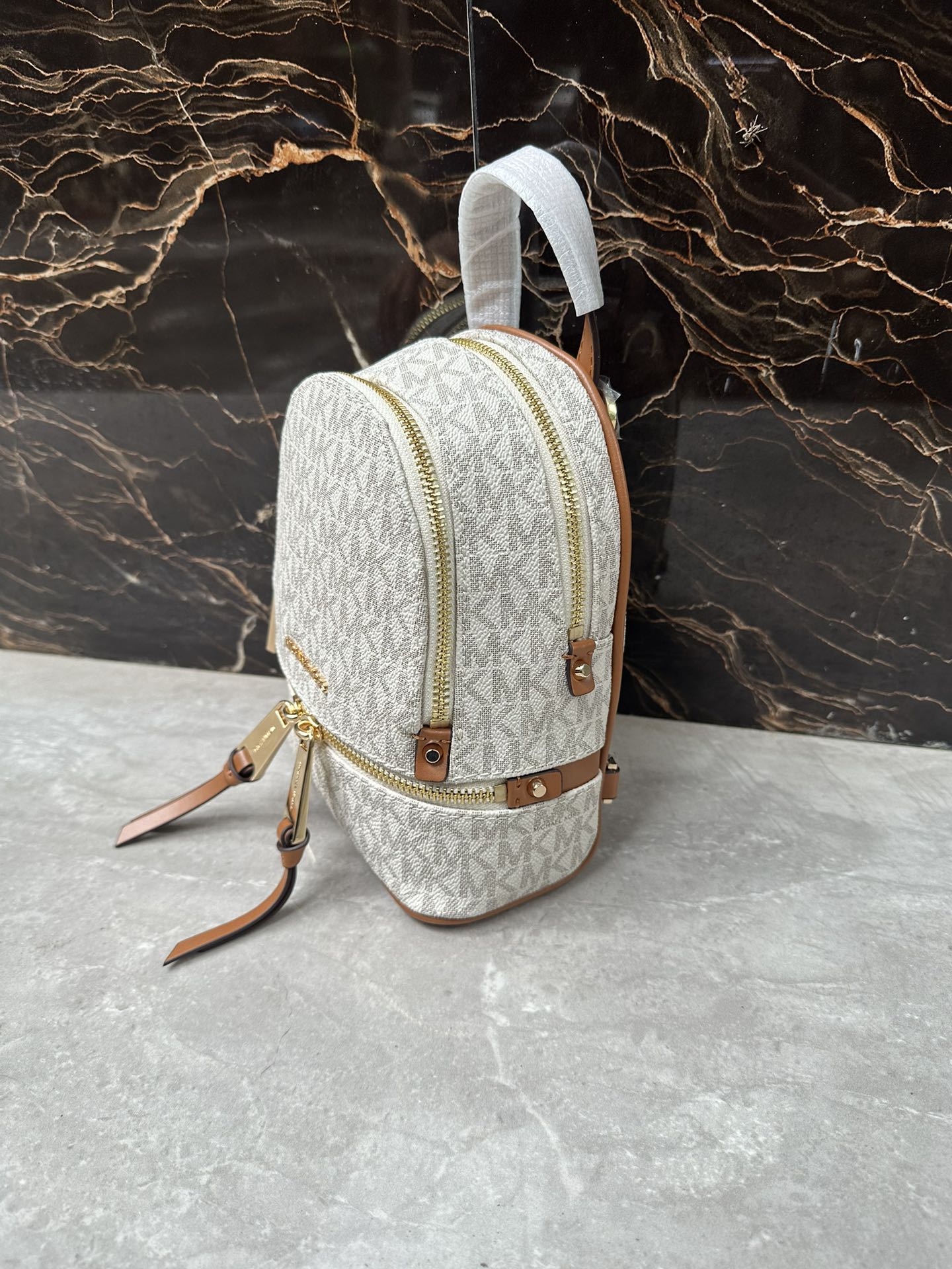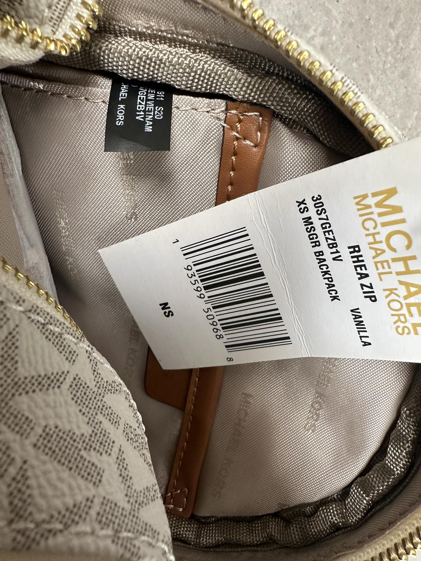 Introducing the Michael Kors Rhea Mini Backpack from the latest collection. This stylish bag, size 17*21*7 cm, features a luxurious vanilla finish and can effortlessly transform into a crossbody or waist bag, adding versatility to your wardrobe. Crafted with high-quality materials, this bag is both fashionable and functional, making it the perfect accessory for everyday use. Upgrade your style with this chic mini backpack that combines practicality with elegance.