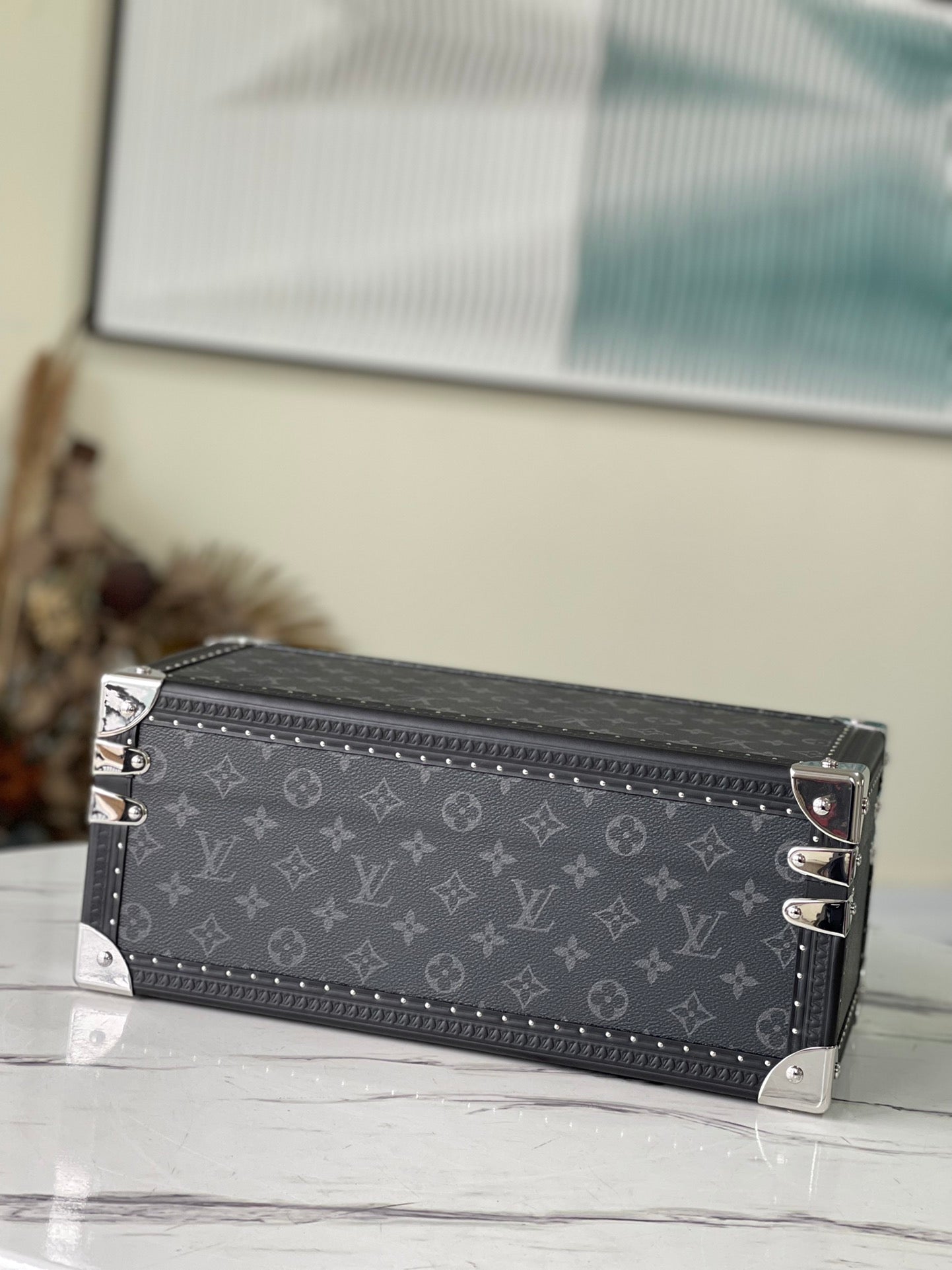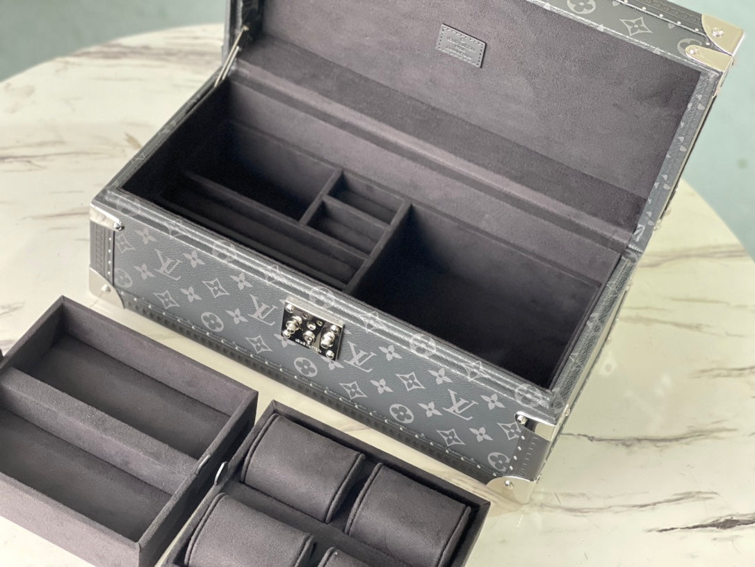 Introducing the M20209 Multifunctional Storage Box, designed with a sophisticated black flower motif and a sleek black interior. Crafted from high-quality Monogram canvas, this elegant hard case pays homage to the classic Coffret 8 Montres, ensuring your precious accessories are both stylishly stored and easily transportable.