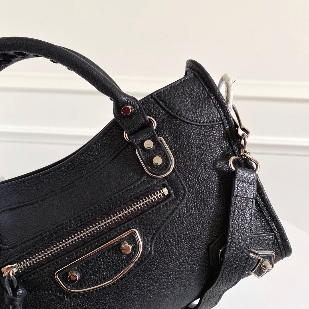Elevate your style with our premium Italian imported goatskin motorcycle bag, featuring a sleek black finish embellished with silver hardware. This original Balenciaga-inspired design combines beauty and durability, making it a timeless addition to your collection.